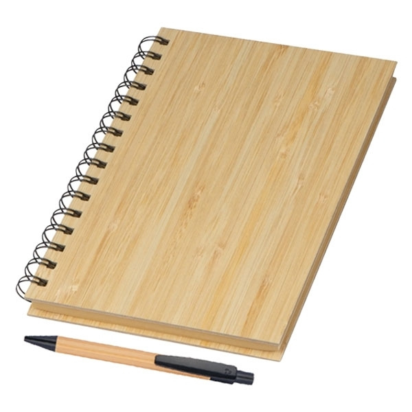 Schickes Öko-Set bestehend aus einem DIN A5 Notizbuch mit Bambus-Cover, Spiralbindung und 160 linierten Seiten aus Recyclingpapier sowie einem Bambus-Kugelschreiber mit blauer Kunststoff-Mine und Kunststoff-Applikationen. Ihre Werbung gravieren wir außen auf den Notizbuch-Cover.