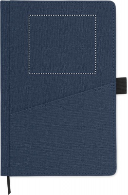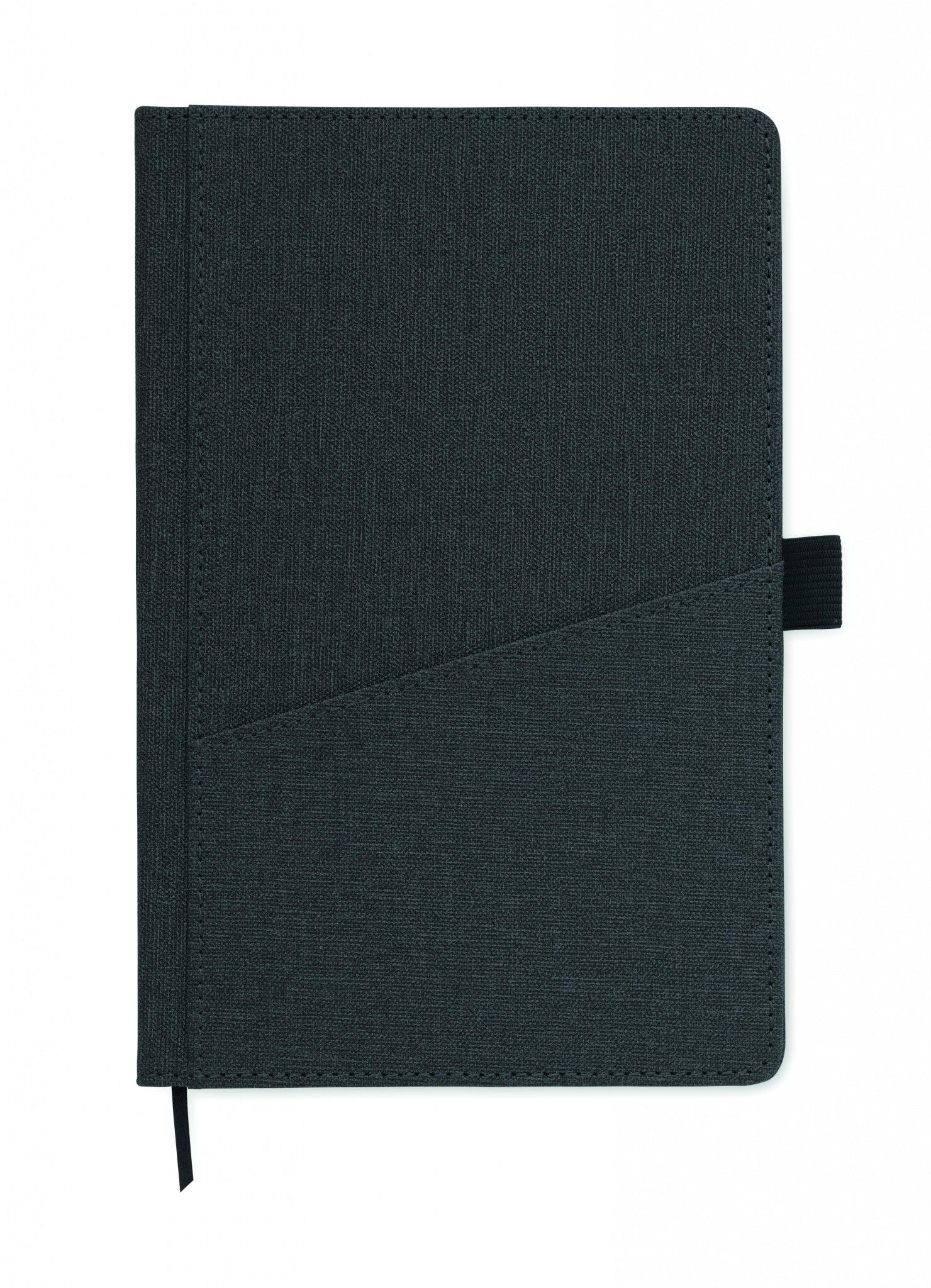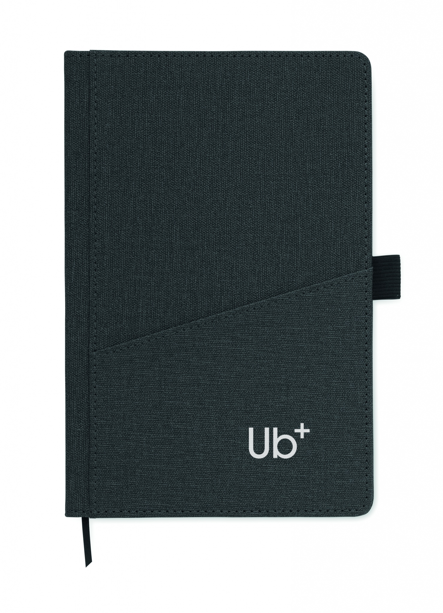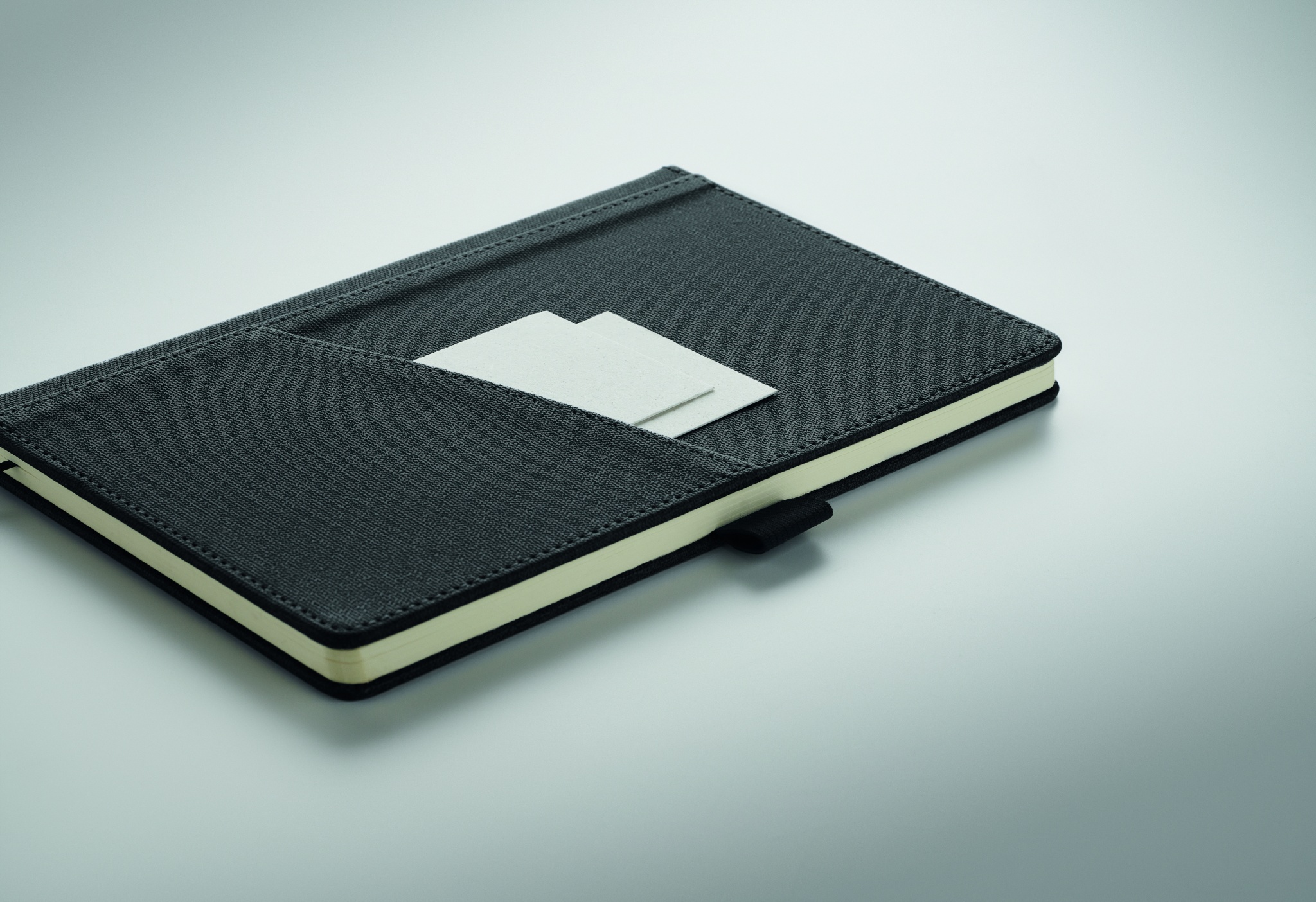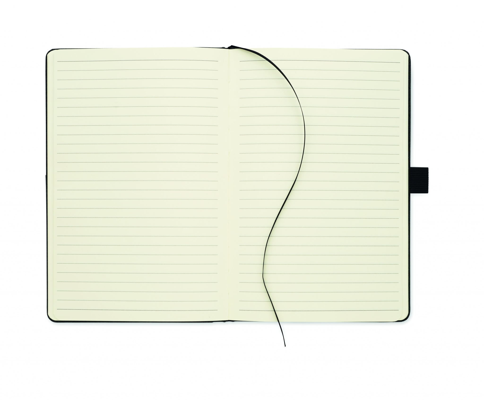 DIN A5 Notizbuch mit gebundenem Hard Cover aus PU. Handyfach auf der Front. 80 Blatt (160 Seiten) liniertes Recyclingpapier. Passendes Lesebändchen.