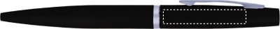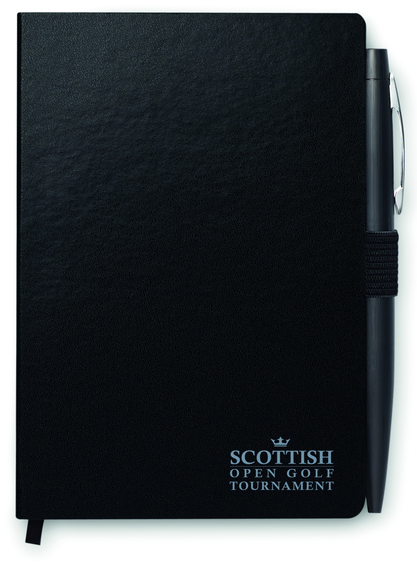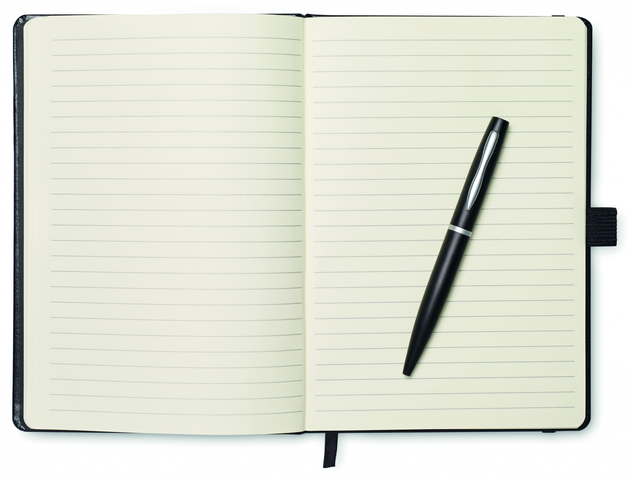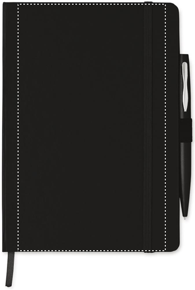 DIN A5 Notizbuch mit Hard Cover aus PU und 72 Blatt (144 Seiten) liniertem Papier. Elastisches Verschlussband und Lesebändchen. Mit passendem Druckkugelschreiber aus Metall. Blaue Tinte.