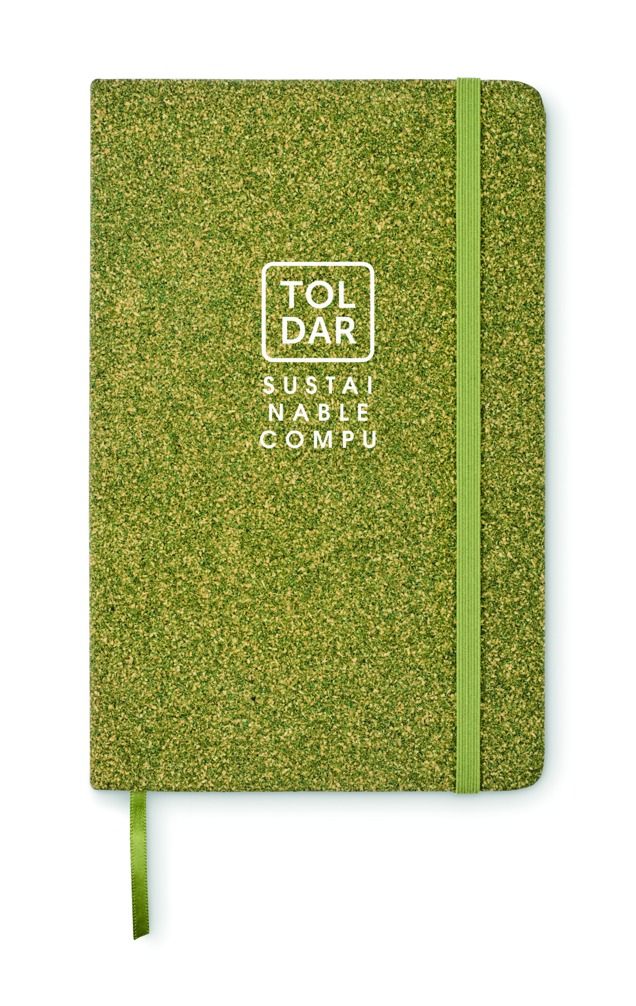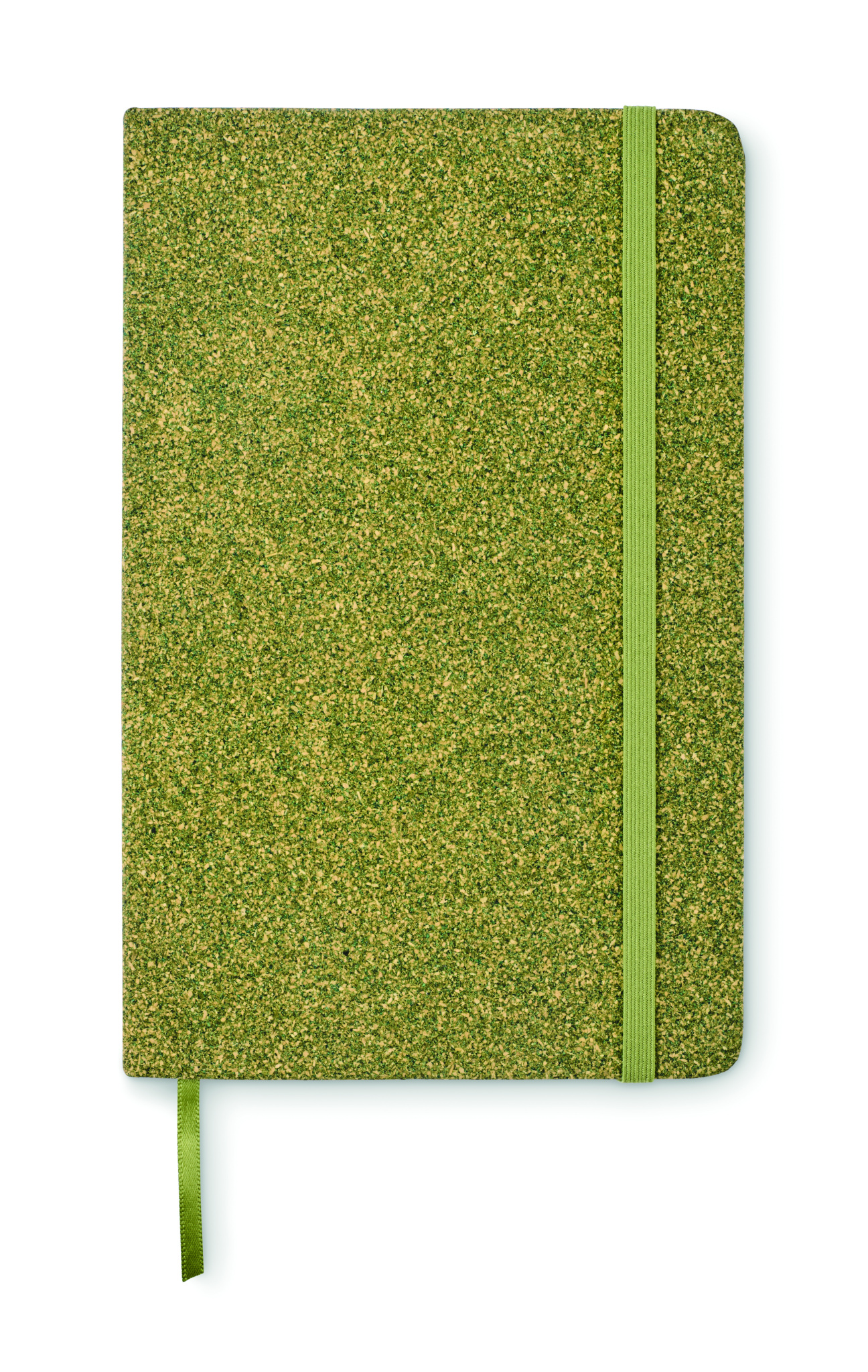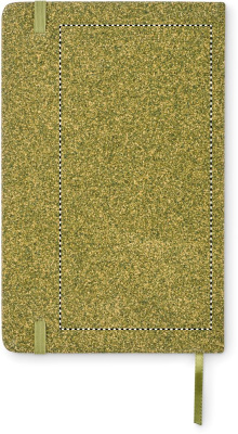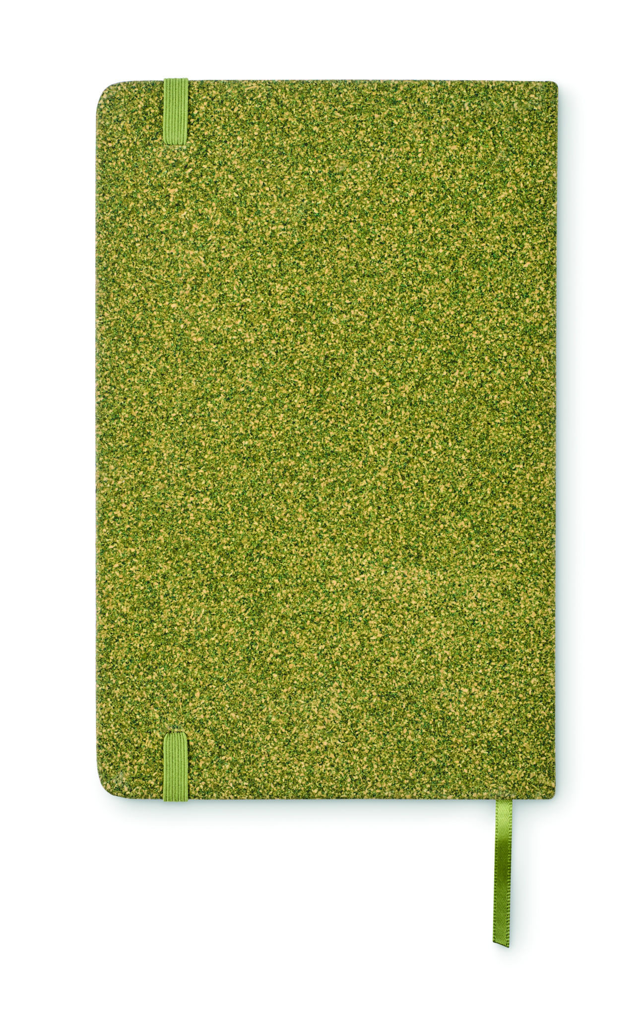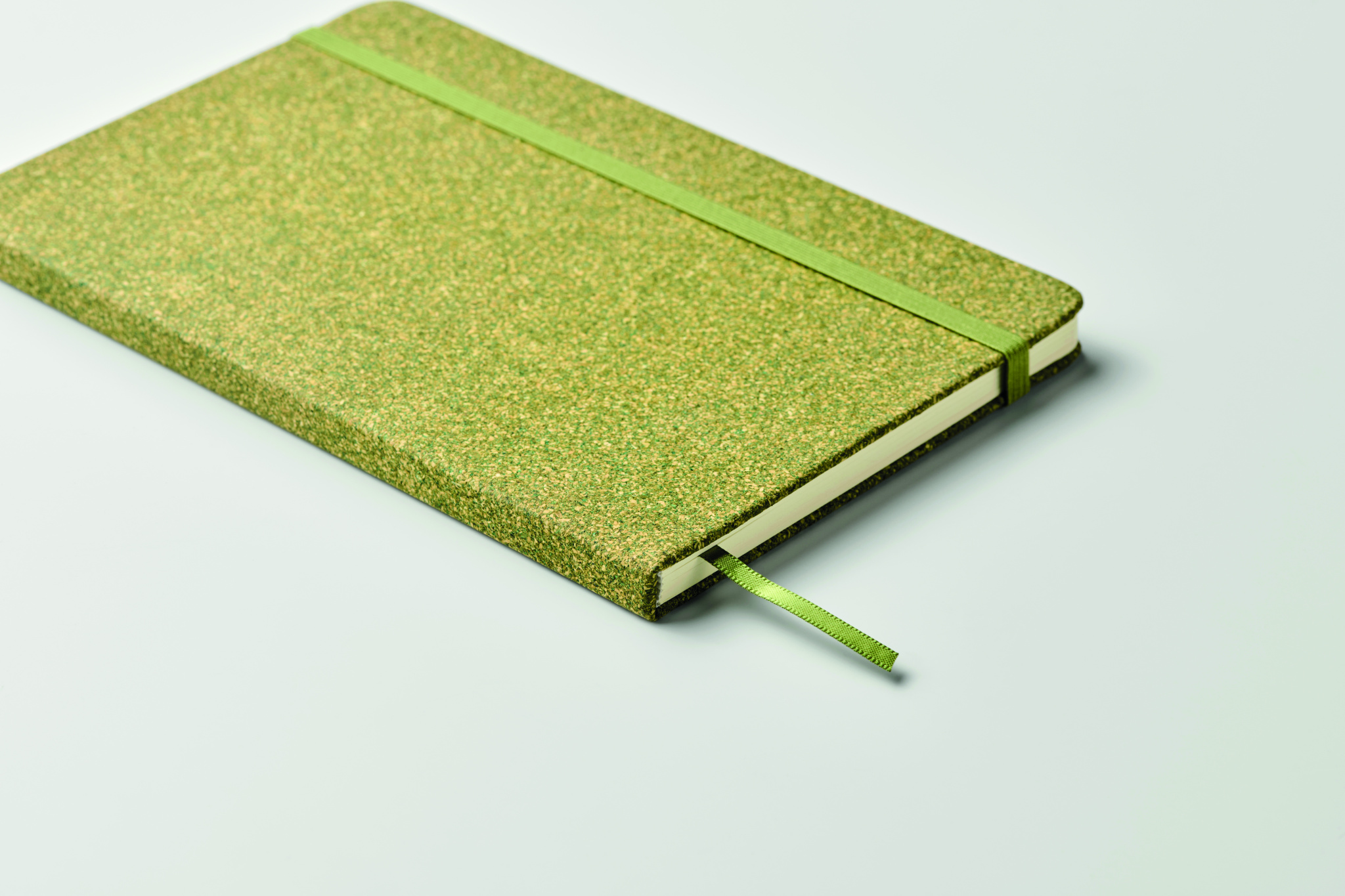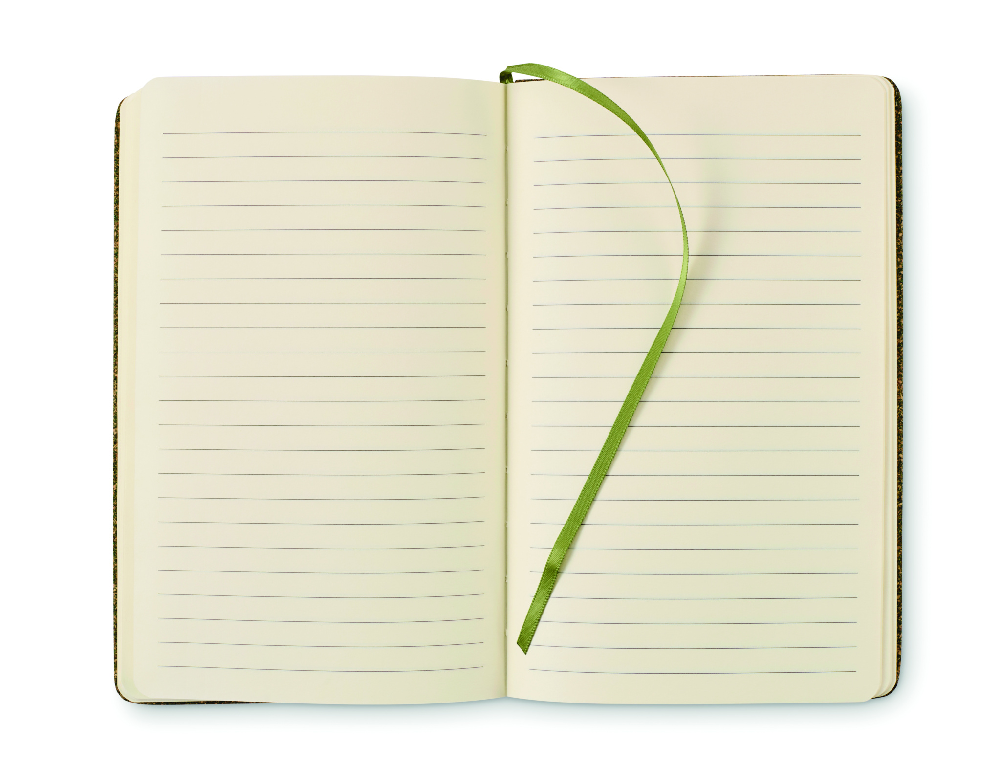DIN A5 Notizbuch mit gebundenem Hard Cover aus 20% Teesatz, 30% Kork und 50% Polycotton-Gewebe. 80 Blatt (160 Seiten) aus liniertem 70 g/m² Recyclingpapier. Passendes elastisches Verschlussband und Lesebändchen. FSC®-certified | FSC MIX CREDIT, N7.1, FSC-C213206