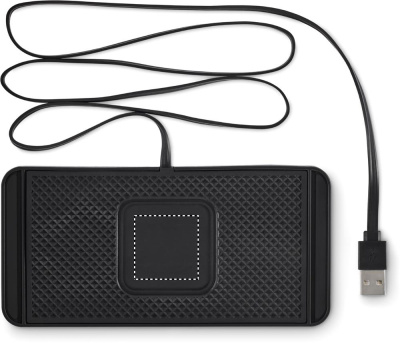 Kabelloses Kfz-Ladegerät 15W. Anti-Rutsch-Pad aus PVC. Anpassbar auf gewünschte Größe durch Zuschnitt der Kanten. Integriertes USB-A-Kabel, Länge 120 cm.