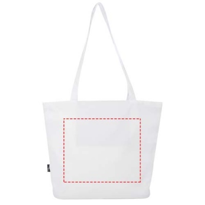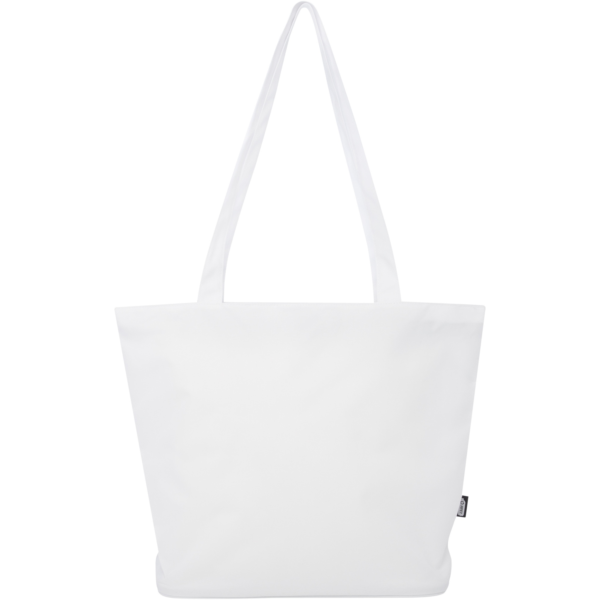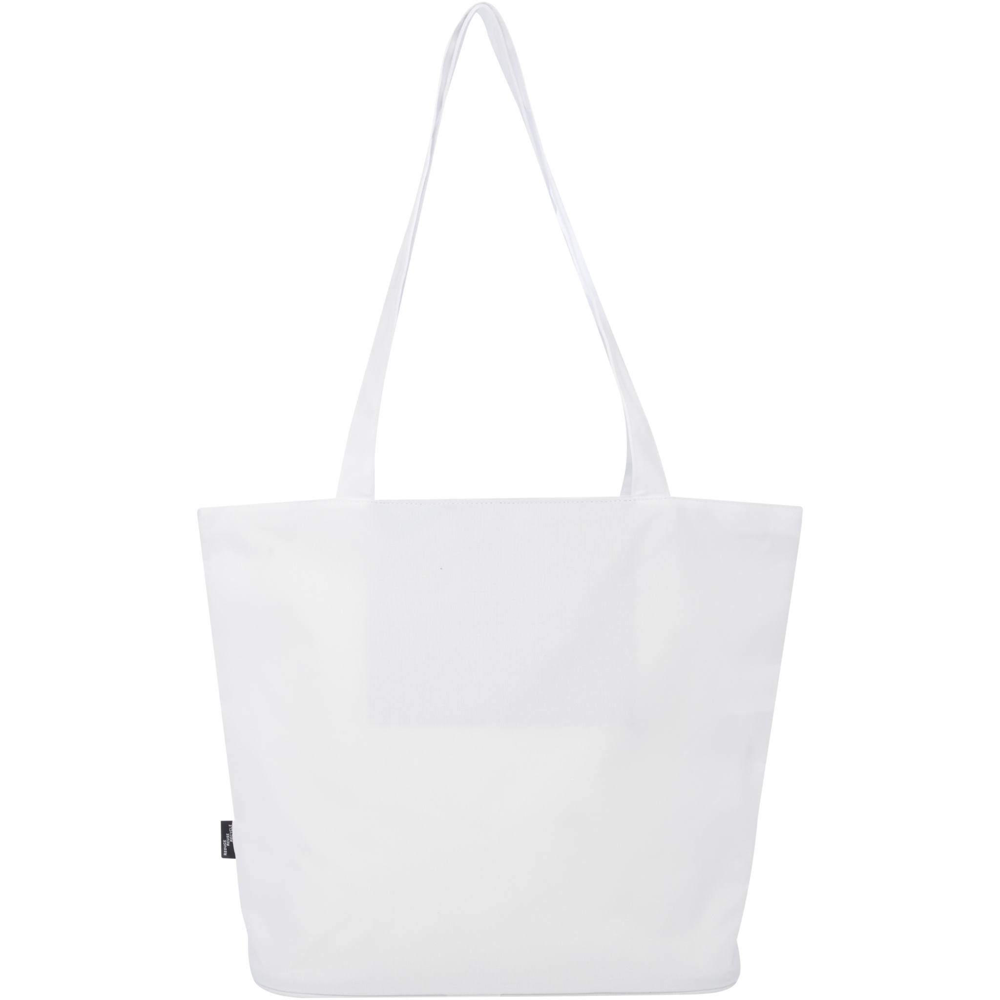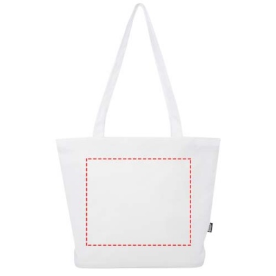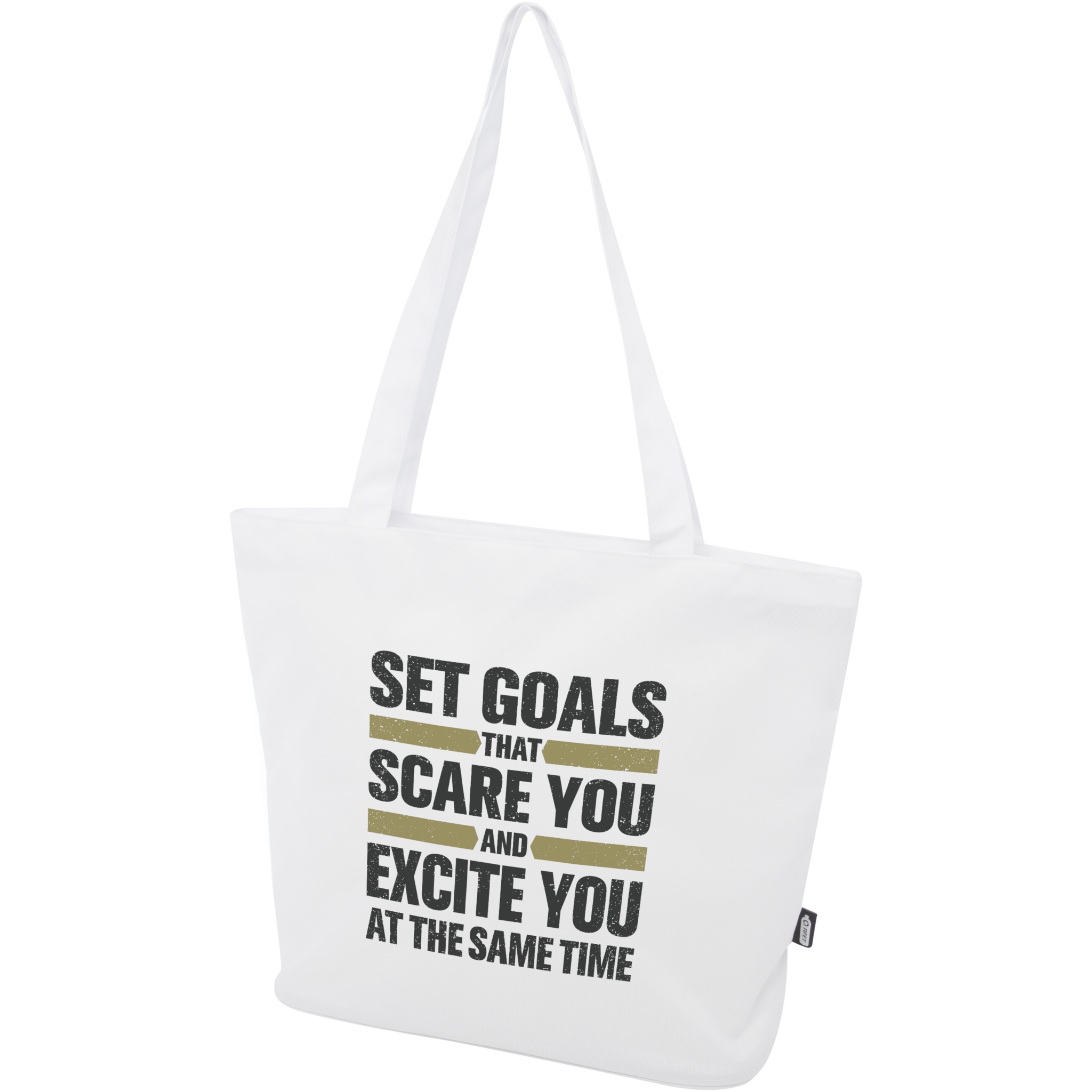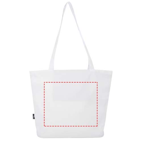 Die Panama GRS-recycelte Tragetasche mit Reißverschluss aus wasserabweisendem 600D RPET ist eine perfekte und nachhaltige Mehrzwecktasche für den Besuch einer Veranstaltung, für den Strand oder für den Lebensmitteleinkauf. Sie verfügt über ein Hauptfach mit Reißverschluss und eine Innentasche mit Reißverschluss, die groß genug ist, um Ihr Telefon und andere wertvolle Gegenstände zu verstauen. Die Griffe sind 34 cm lang, sodass die Tasche leicht über der Schulter getragen werden kann. Belastbarkeit bis zu 10 kg. PVC frei.