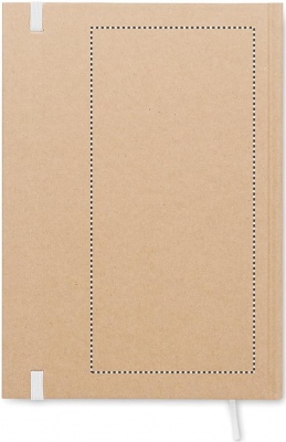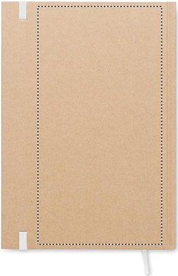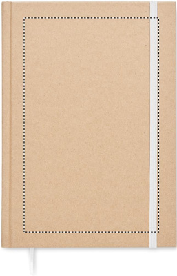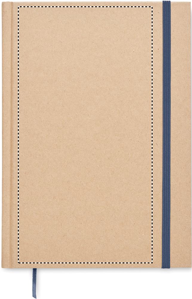 A5 notebook with hard recycled carton cover. Casebound. 200 lined recycled paper pages (100 sheets/80 gsm). Elastic closure strap and ribbon page-marker. Made in EU.