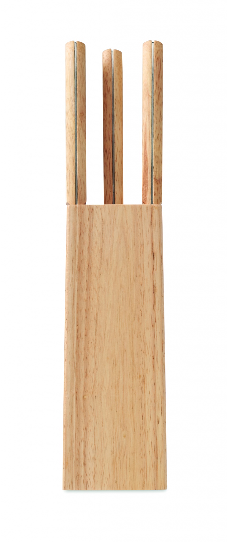 Wooden knife set. Includes base holder and 5 knives: Chef, bread, slicing, multi-functional and paring. Stainless steel with wooden handle.