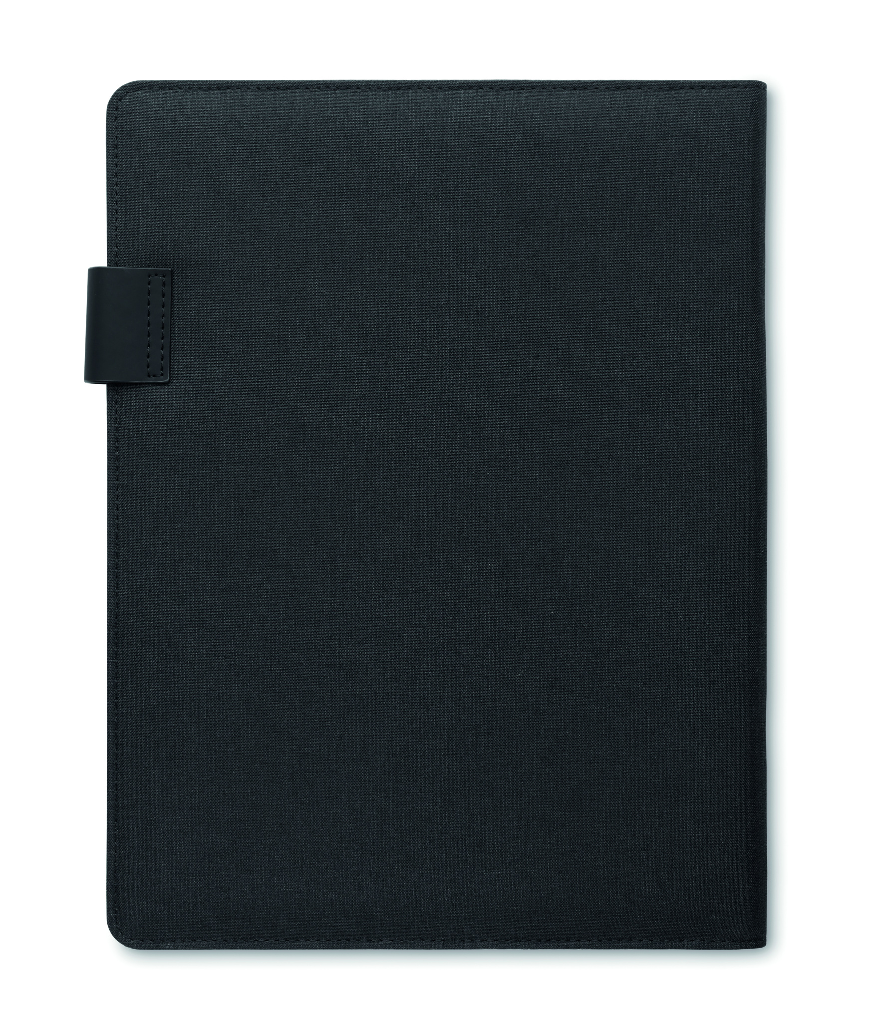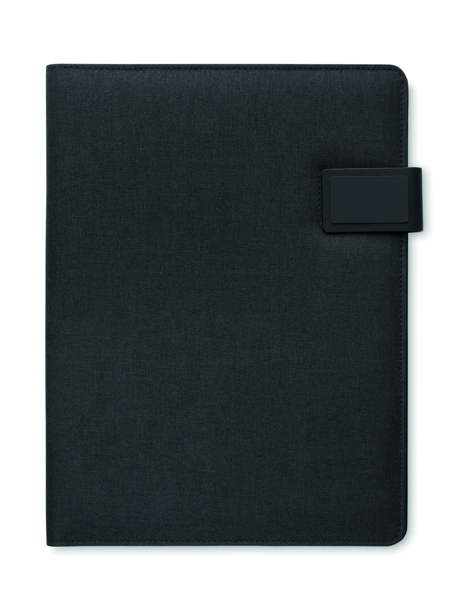 A4 conference folder with linen-PU cover. 5000 mAh power bank and 15W magnetic wireless charger. 20 lined sheets notepad. Multiple internal compartments. Magnetic closure. Elastic pen holder.