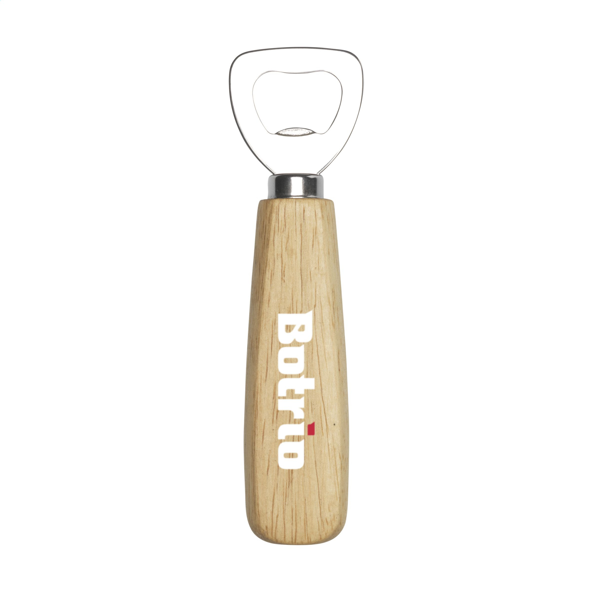 Durable bottle opener with beech wood handle. Designed for ease of use.