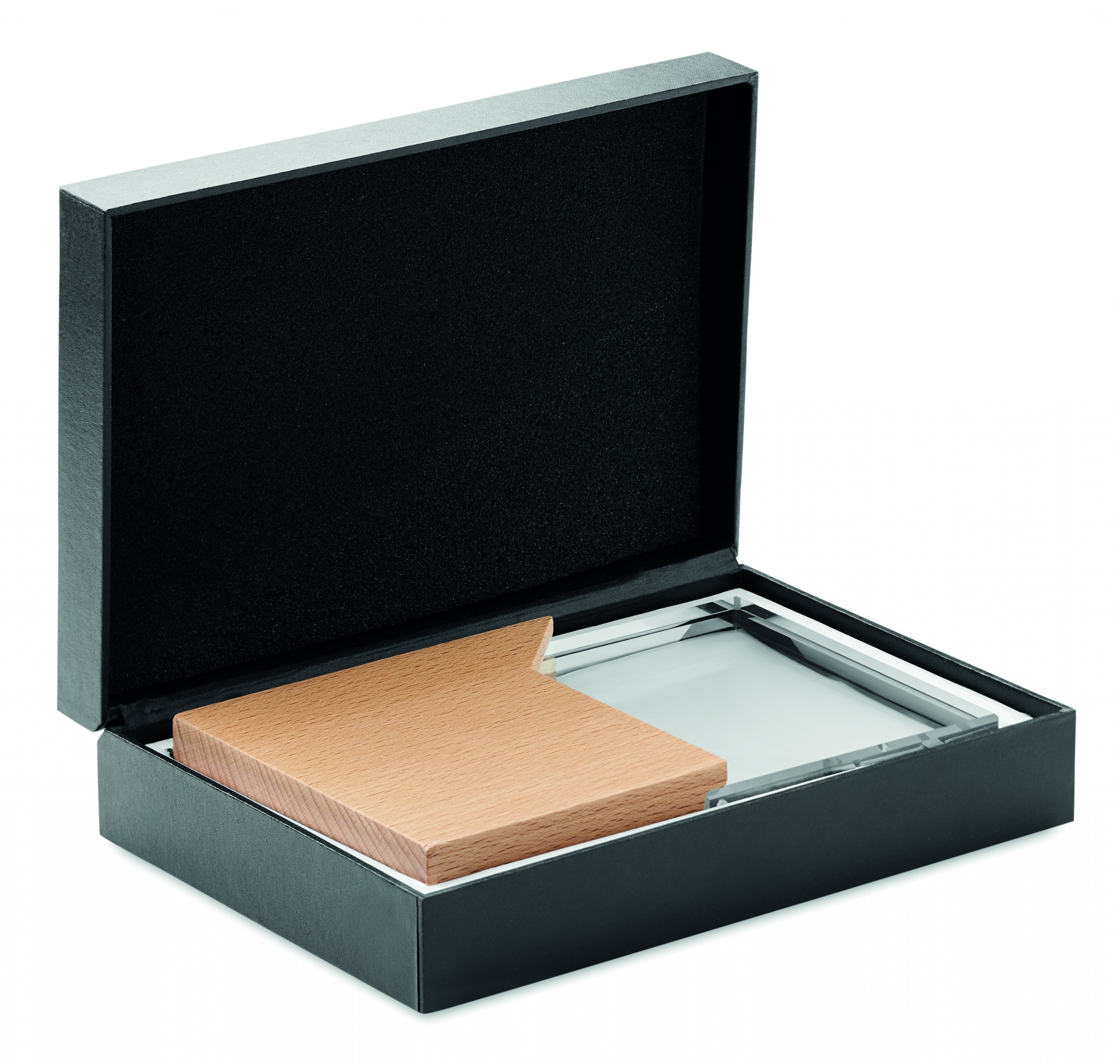 Crystal award or memorial plaque on a beech wooden base in a gift box.