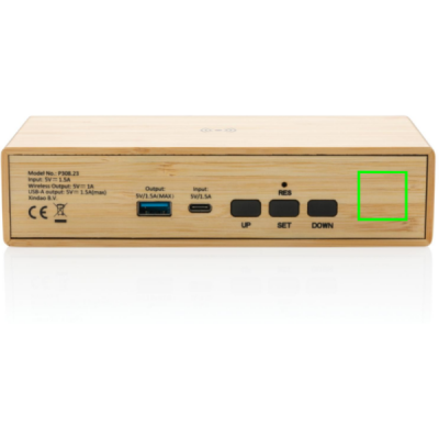 5W wireless charger alarm clock with complete bamboo exterior and 24 hour time indicator. With USB port on the backside to charge via cable. Including 150 cm PVC free TPE micro usb cable. Compatible with all QI enabled devices like Android latest generation, iPhone 8 and up Input: 5V/1.5A; Wireless Output: 5V/1A - 5W; 1 USB output port, 5V/1A.