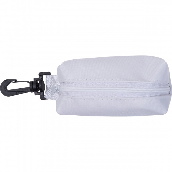 Polyester pouch with a zipper, plastic carabiner hook, and eight different colored pencils. Your logo is printed on the pouch.
