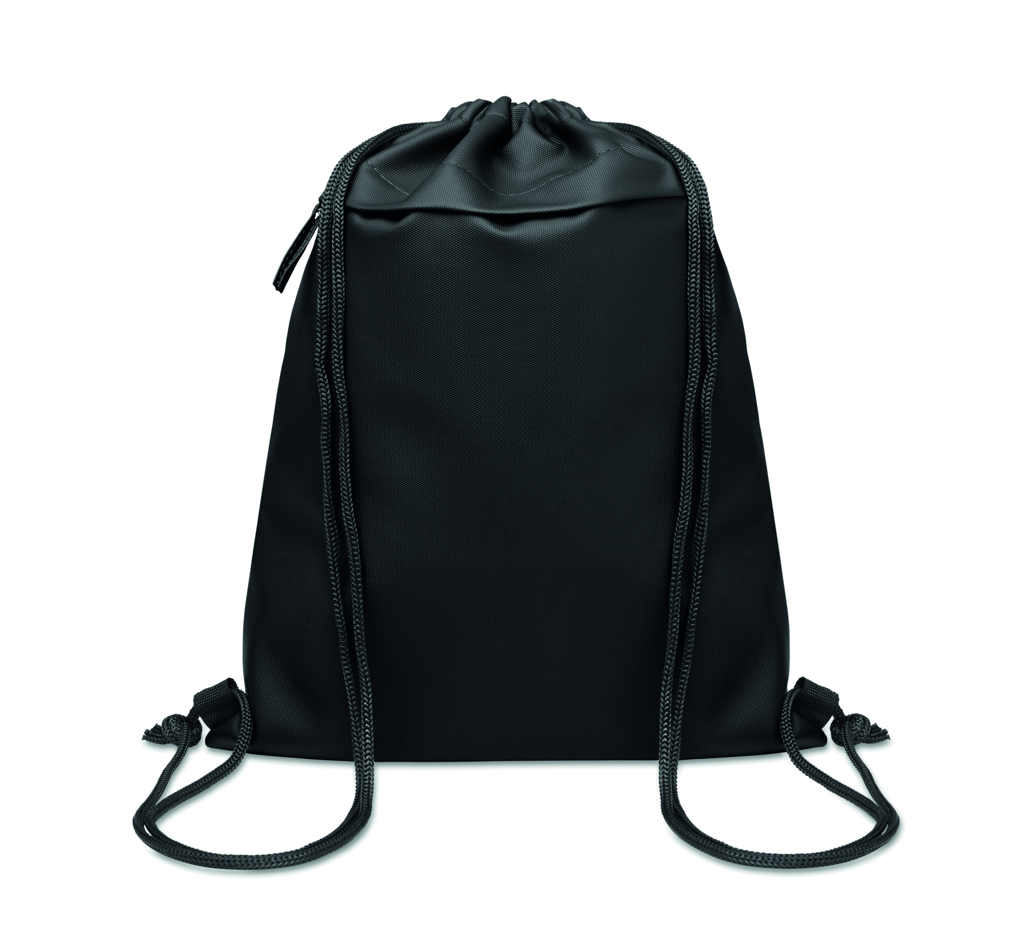 Drawstring bag with PU coated 600D RPET polyester and 190T RPET polyester lining. Zippered front pocket.
