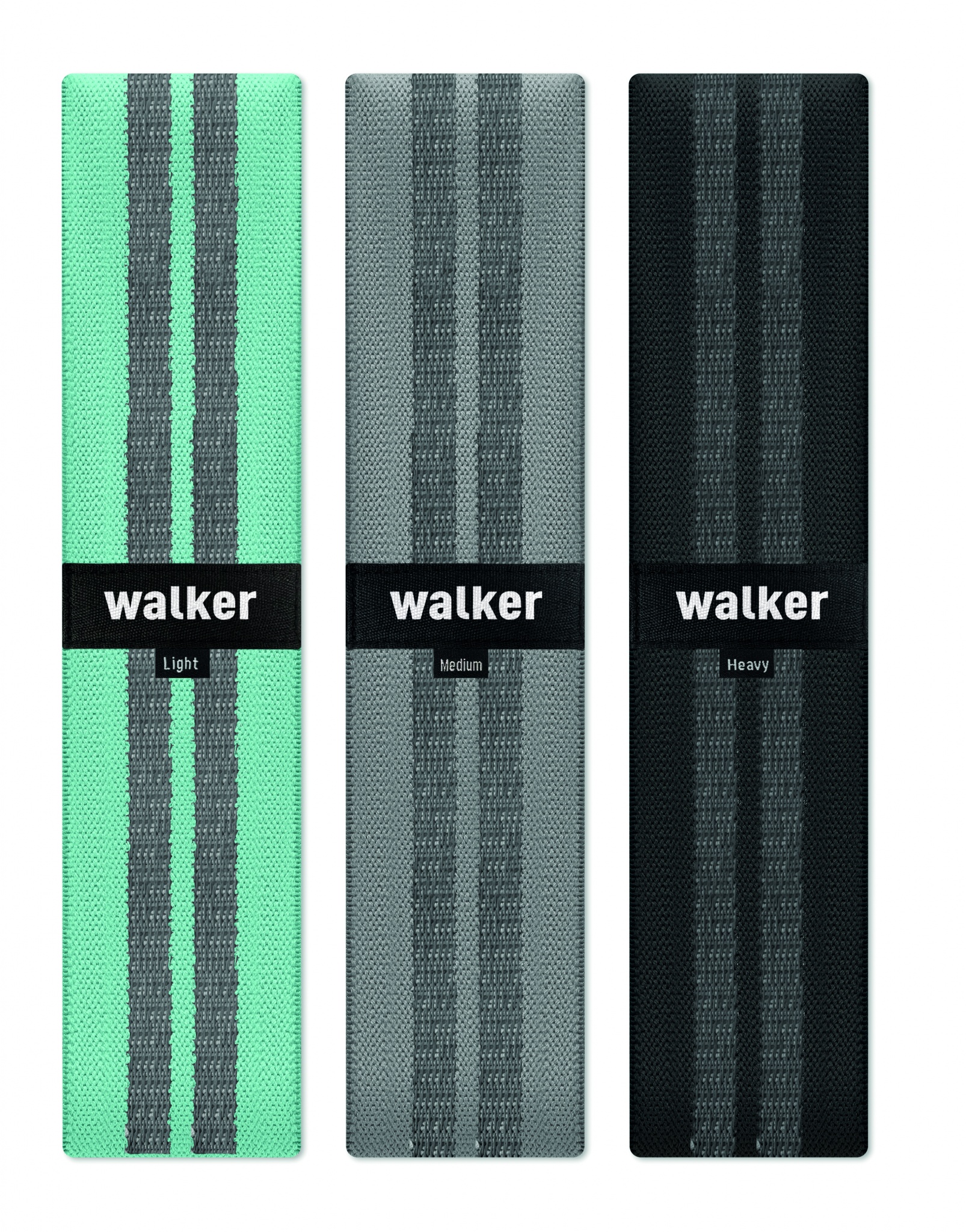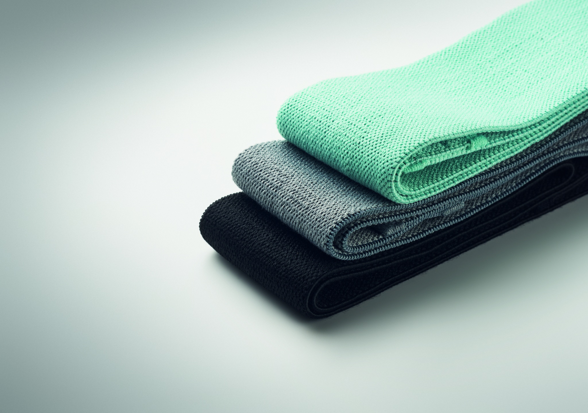 Set of 3 fitness bands in terylene, cotton and latex silk in an RPET pouch. Fitness bands all have a different strength for optimal training.