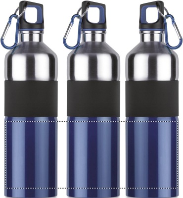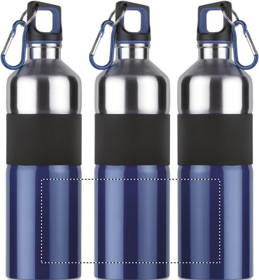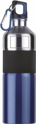 Single wall bicolour stainless steel bottle with rubber grip and carabiner hook. Capacity: 750 ml. The carabiner is not for climbing (non professional use). Leak free.