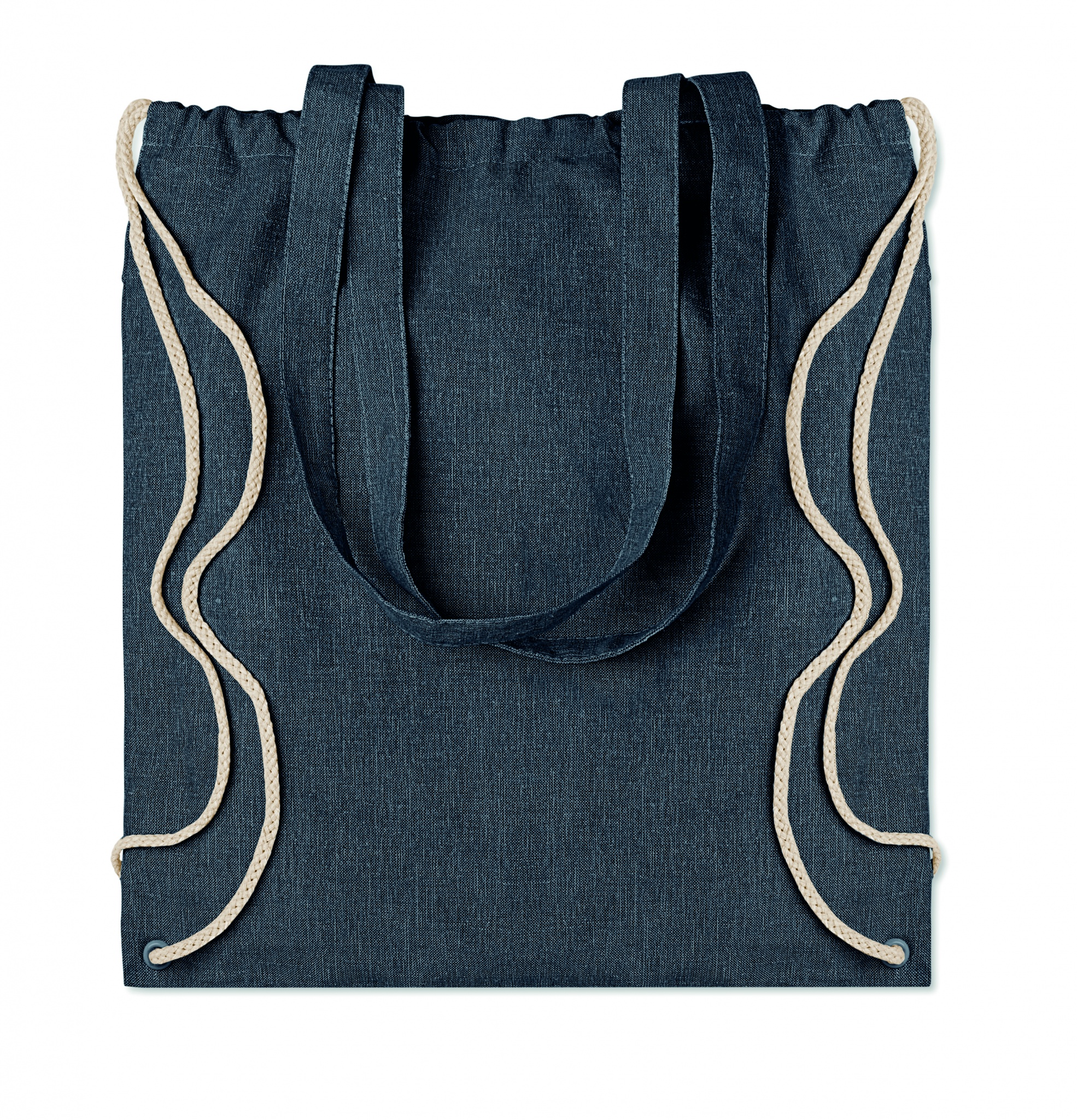 2-tooniline taaskasutatud puuvillast ja taaskasutatud polüestrist poekott pingutusnööri ja pikkade sangadega (20%/80%). u. 140 gr/m². See üksus võib pärast printimist kokku tõmbuda.