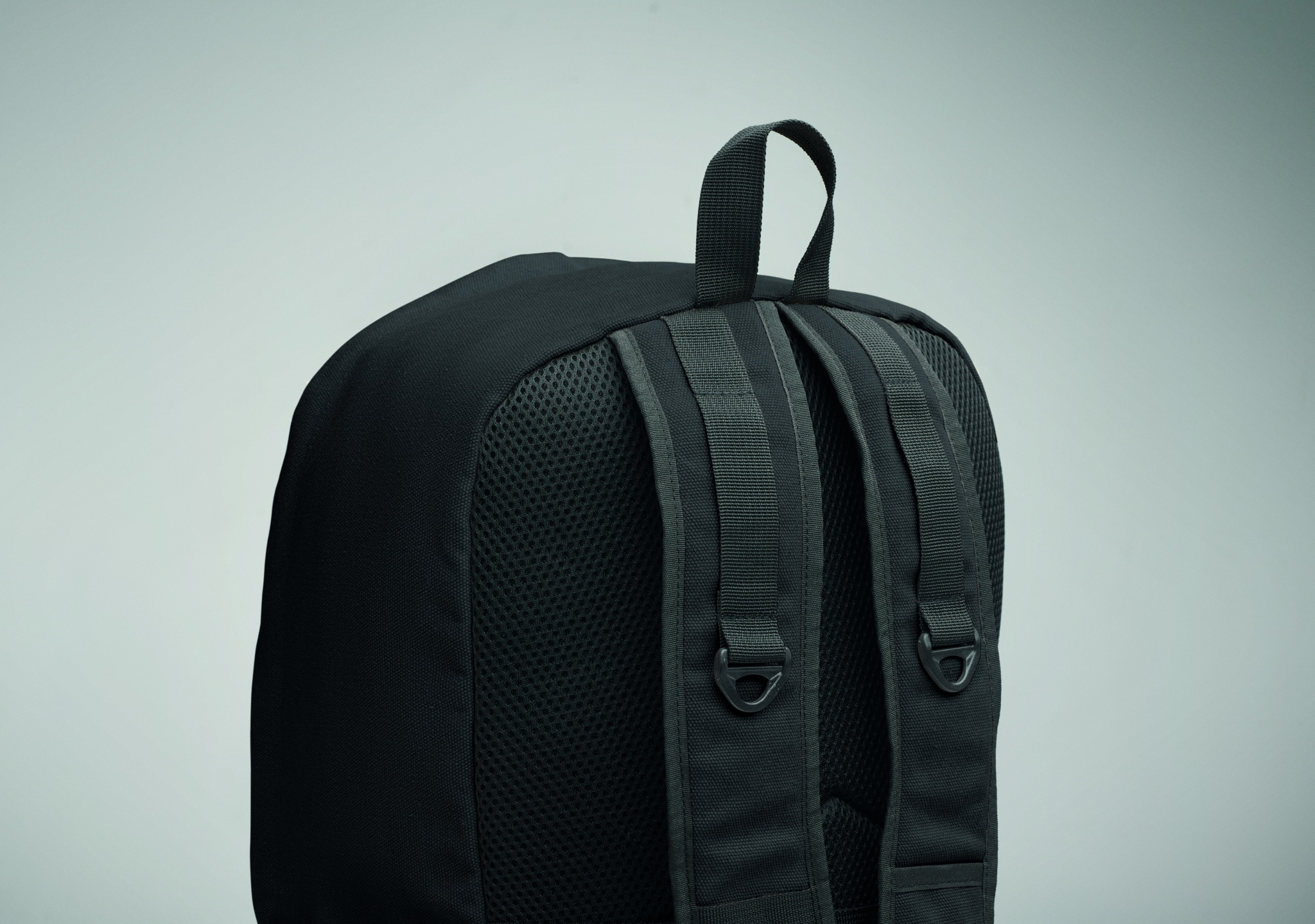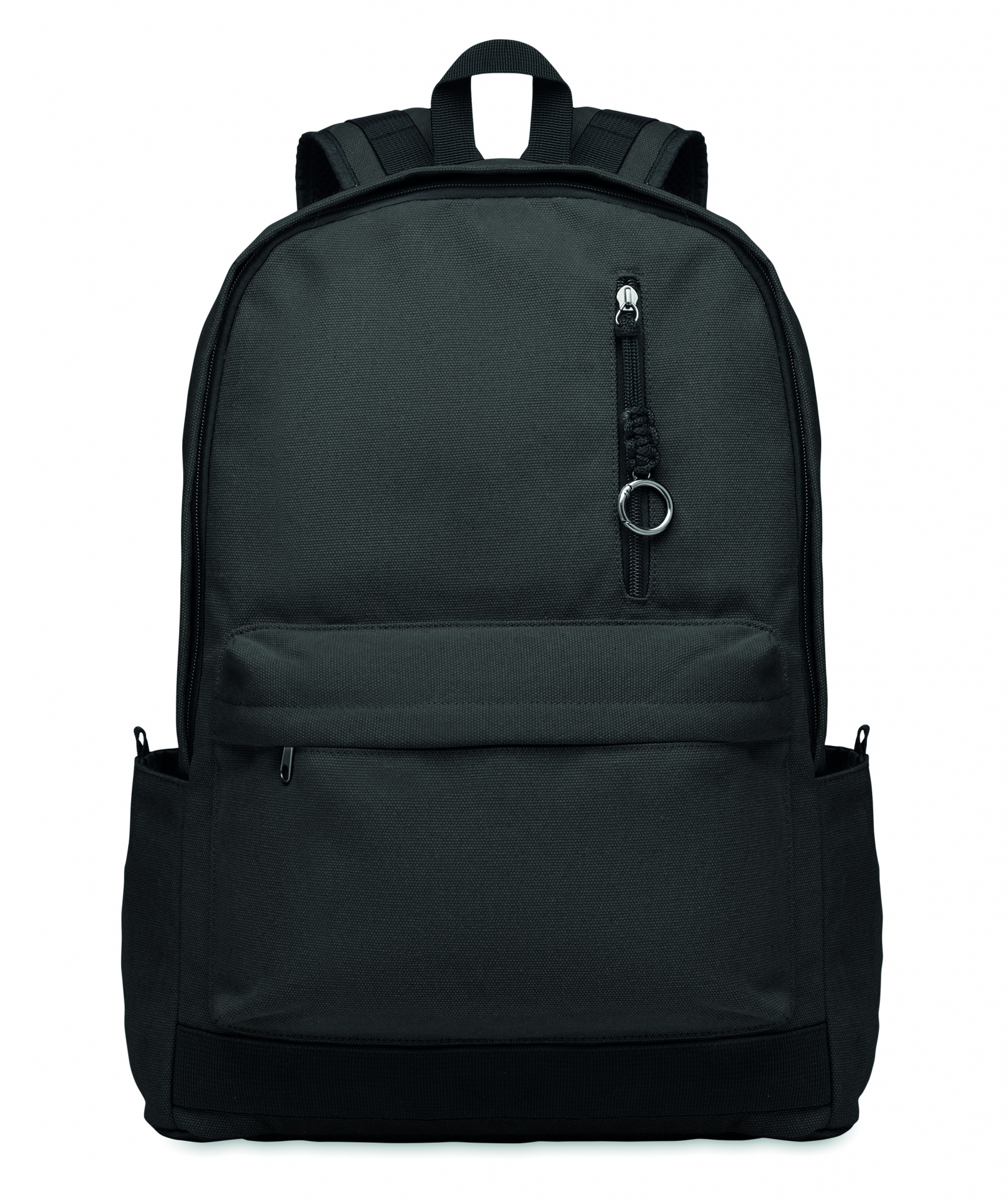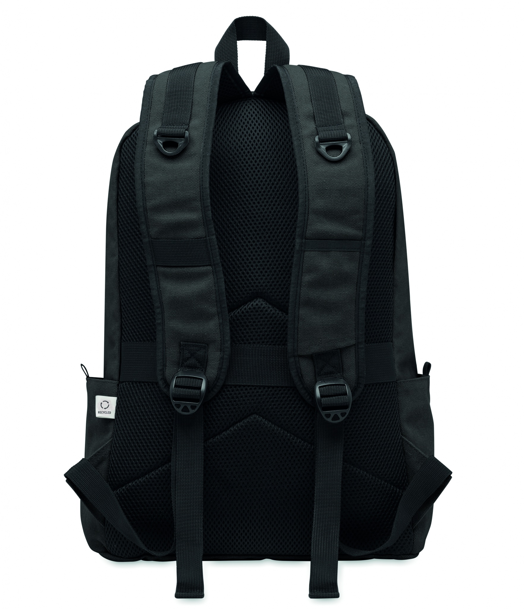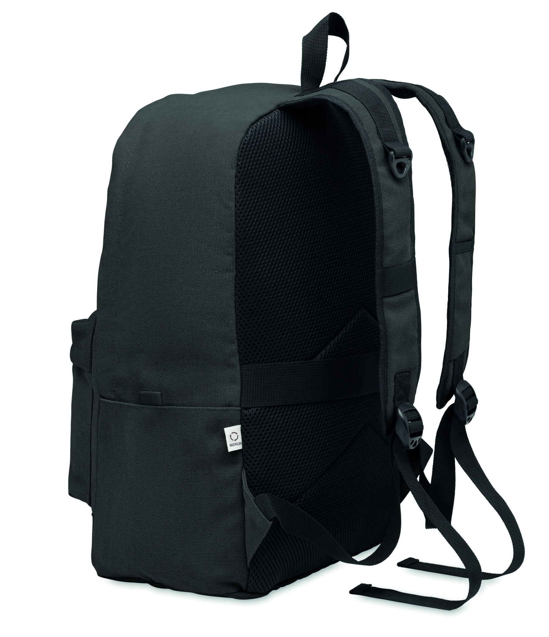Taaskasutatud pestud lõuendist 15-tolline sülearvuti seljakott. Suur eesmine lukuga tasku sisemise sülearvuti sahtliga. Ees väike lukuga tasku. Kaks külglibisevat taskut. Polsterdatud selja- ja õlarihmad, tagapaneel ja alus. 450 gr/m².