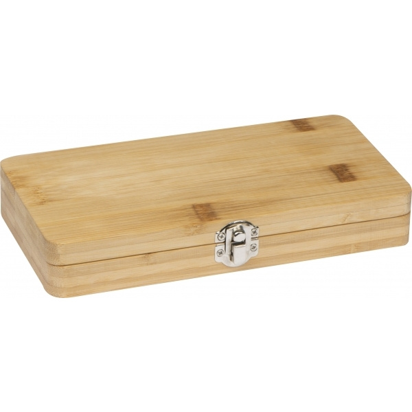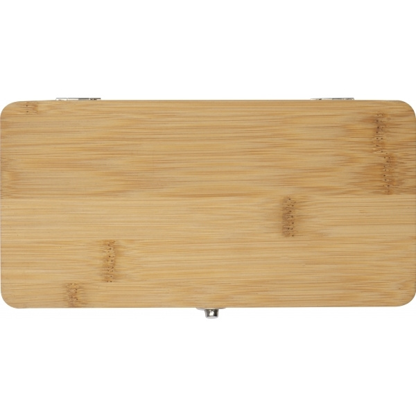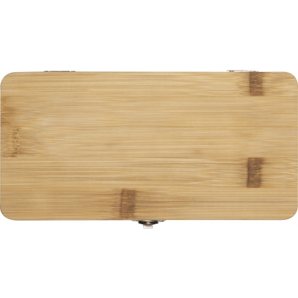 22-osaline tööriistakomplekt, mis koosneb 3-st kruvikeerajast, erinevatest otsikutest koos adapteriga, samuti lõikurist ja 4-st kuuskantvõtmest bambusest karbis. Teie logo graveeritakse korpusele.