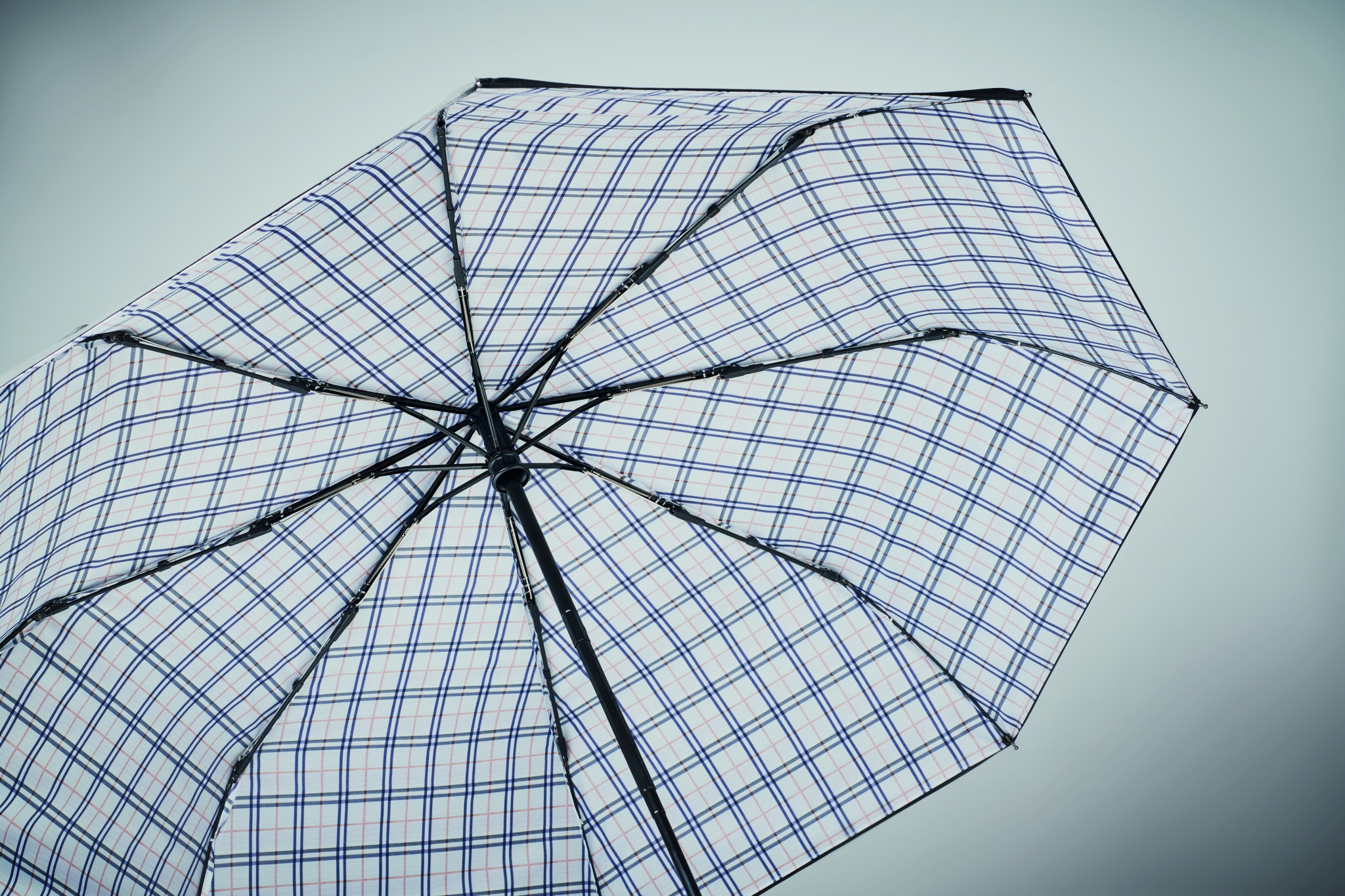 23-tolline 3-kordne automaatne avanev/sulguv tuulekindel vihmavari kahekihilisest ruudulise sisemustriga 190T pongeest. Musta värvitud raam ja võll. Kaheosaline mustast klaaskiust nikeldatud keskosa. Kumer puidust käepide.