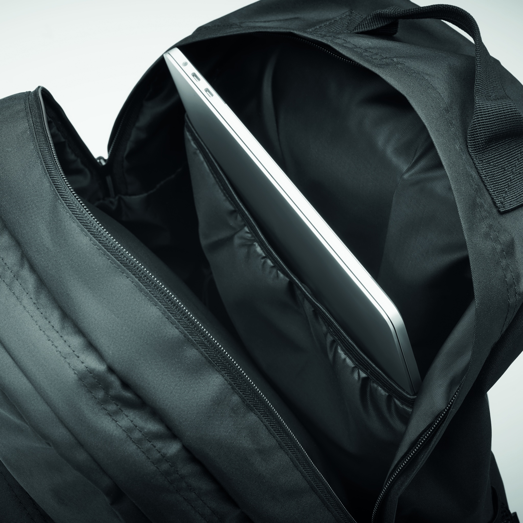 15-tolline sülearvuti seljakott 300D RPET polüestrist. Sellel on 2 suurt lukuga sektsiooni, topelt lukuga esitaskud ja võrgust küljetasku. Polsterdatud selja-, ala- ja õlarihmad.