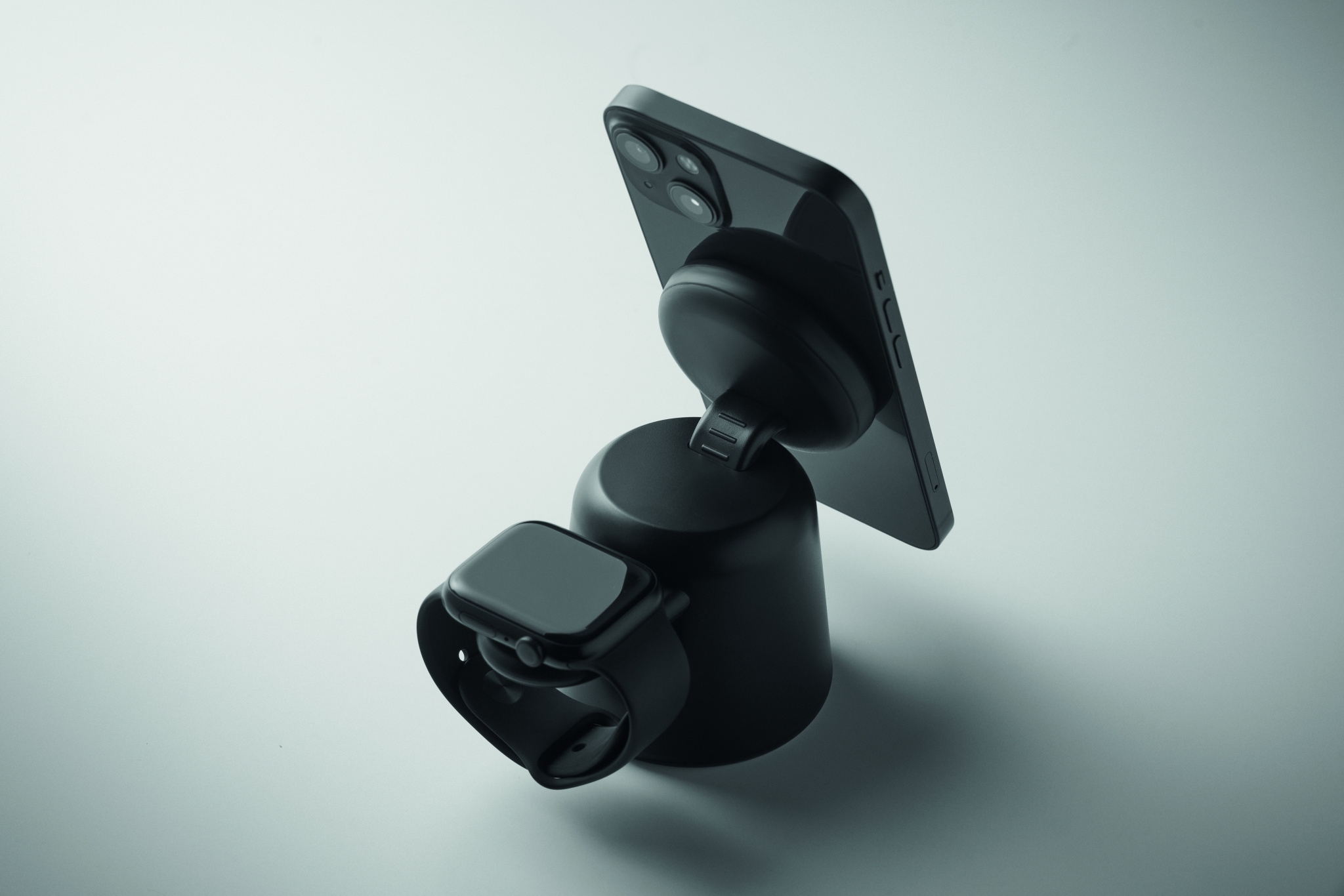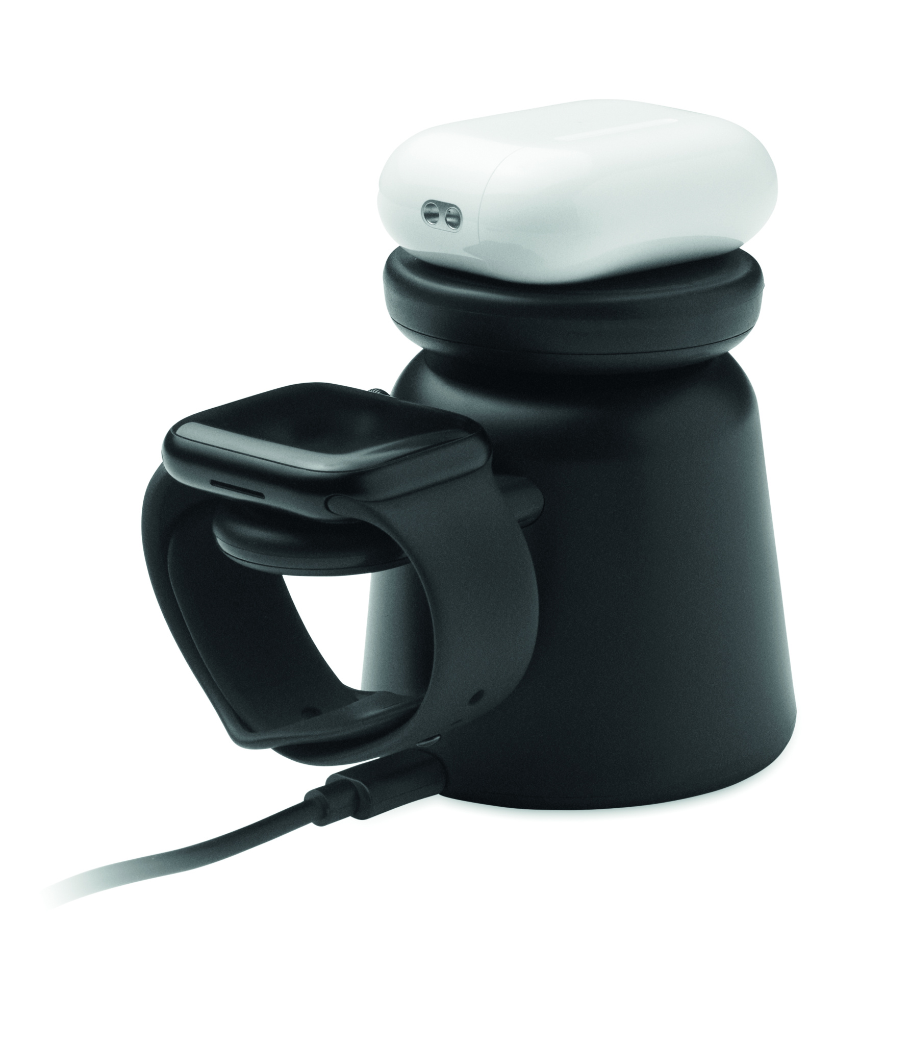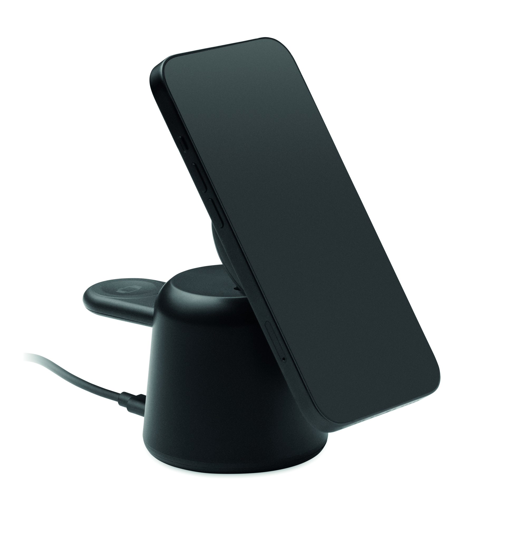 3-ühes ABS-plastist laadimisjaam. Komplektis 15 W magnetiline juhtmevaba laadija telefonile ja TWS-ile koos telefonihoidiku funktsiooniga ning nutikella laadija (ainult iOS-ile). Magnetiline funktsioon ühildub iPhone® 12 ja uuemate mudelitega. Komplektis täiendav magnetiline metallrõngas teiste mittemagnetiliste juhtmevabalt laetavate telefonide laadimise toetamiseks.