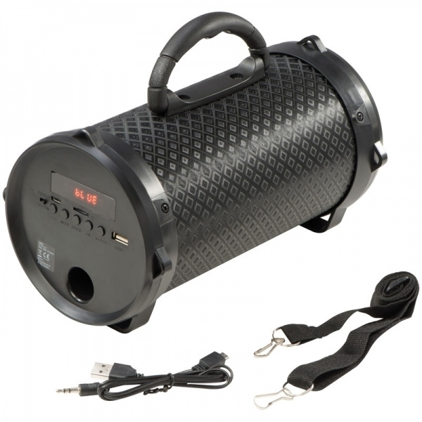 Paljude funktsioonidega Bluetooth-kõlar: FM-raadio, AUX-port, MP3 taasesitus Micro SD-kaartide või USB-pesa kaudu, sisaldab 3,5 mm pistikupesaga USB-laadimiskaablit, samuti eemaldatavat kanderihma ja 2-tunnist aku kasutusaega. Teie logo trükitakse korpusele.