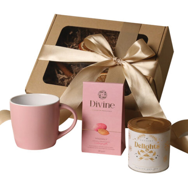 Setti sisältää: Handy Velvet -mukin, väri roosanpunainen-valkoinen / vaaleansininen-valkoinen / Handy Cool harmaanvalkoinen, jonka voi personoida, praliinit – mantelit suklaassa ja vadelmajauheessa (vaaleanpunainen) / mantelit suklaassa ja kookoksessa (sininen) / appelsiininkuori tummassa suklaassa (harmaa), jälkiruokaherkut – mustaherukat valkosuklaassa ja vadelmajauheessa pakattuna talviaiheiseen tuubiin. Kaikki pakattu tyylikkääseen, ikkunalliseen ekologiseen pahvilaatikkoon. Muita personointivaihtoehtoja: painatus mukiin, yrityksen logo, nauha tai tasku talviaiheella ja kultaisella painatuksella.