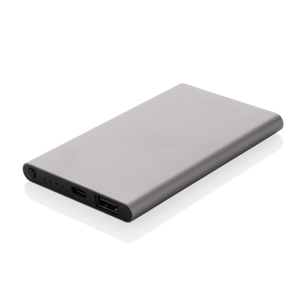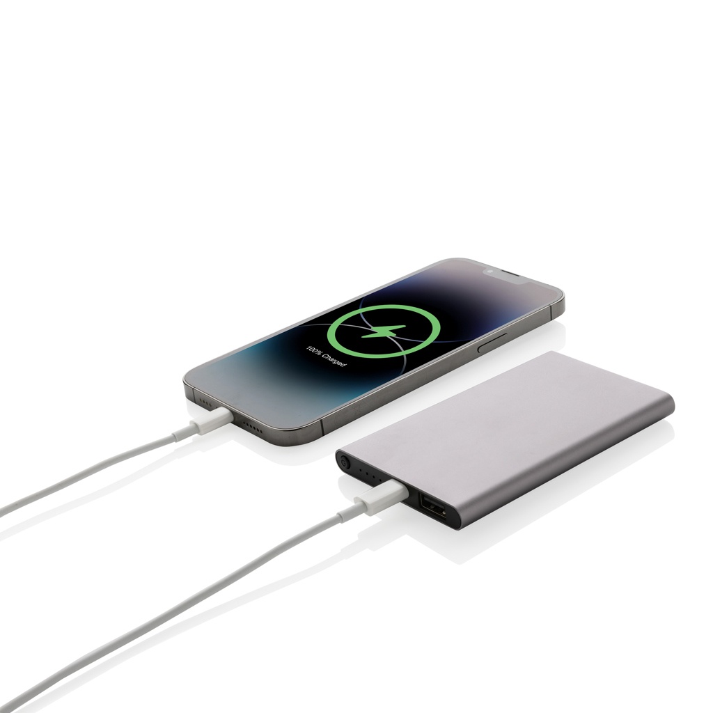 4.000 mAh:n litteä virtapankki, jonka kotelo on valmistettu RCS-sertifioidusta kierrätysalumiinista/ABS-muovista. RCS (Recycled Claim Standard) on standardi, jonka avulla tuotteen kierrätyspitoisuus voidaan todentaa koko toimitusketjussa. Kierrätetyn materiaalin kokonaismäärä:: 36% tuotteen kokonaispainosta. Virtapankki tukee sekä USB A että C-tyypin kautta tapahtuvaa latausta. Virtapankki sisältää pitkäkestoisen 4.000 mAh:n A-luokan litiumpolymeeriakun. Virran merkkivalot ilmoittavat jäljellä olevan energiatason, joten tiedät aina, milloin tuote tulee ladata uudelleen.; C-tyypin tulo 5V/2A; C-tyypin lähtö: 5V/2A USB A -lähtö: 5V/2A. Tuote ja tarvikkeet PVC-vapaita. Mukana RCS-sertifioitu kierrätetty TPE-latauskaapeli. Pakattu FSC® mix -pakkaukseen.
