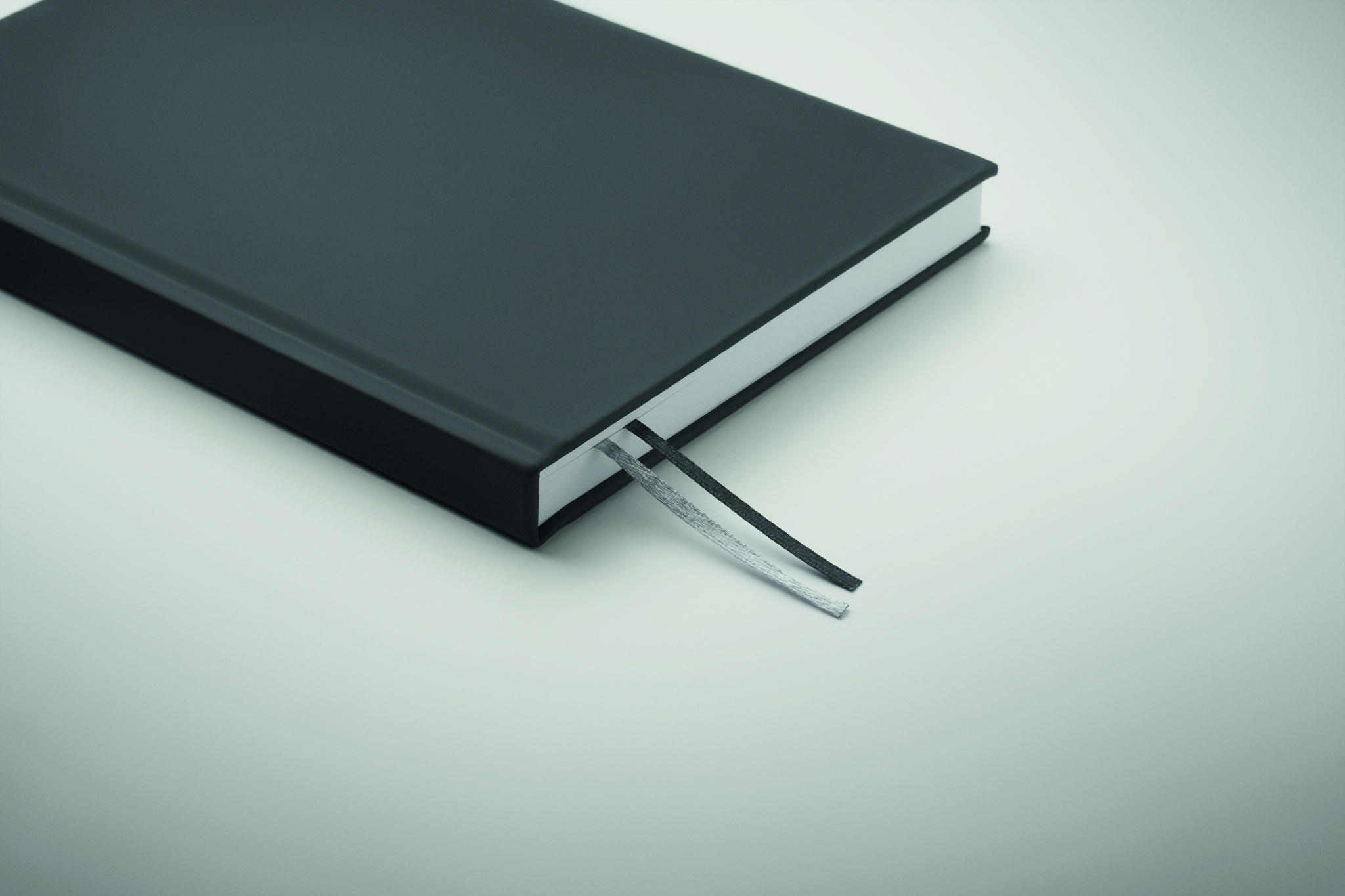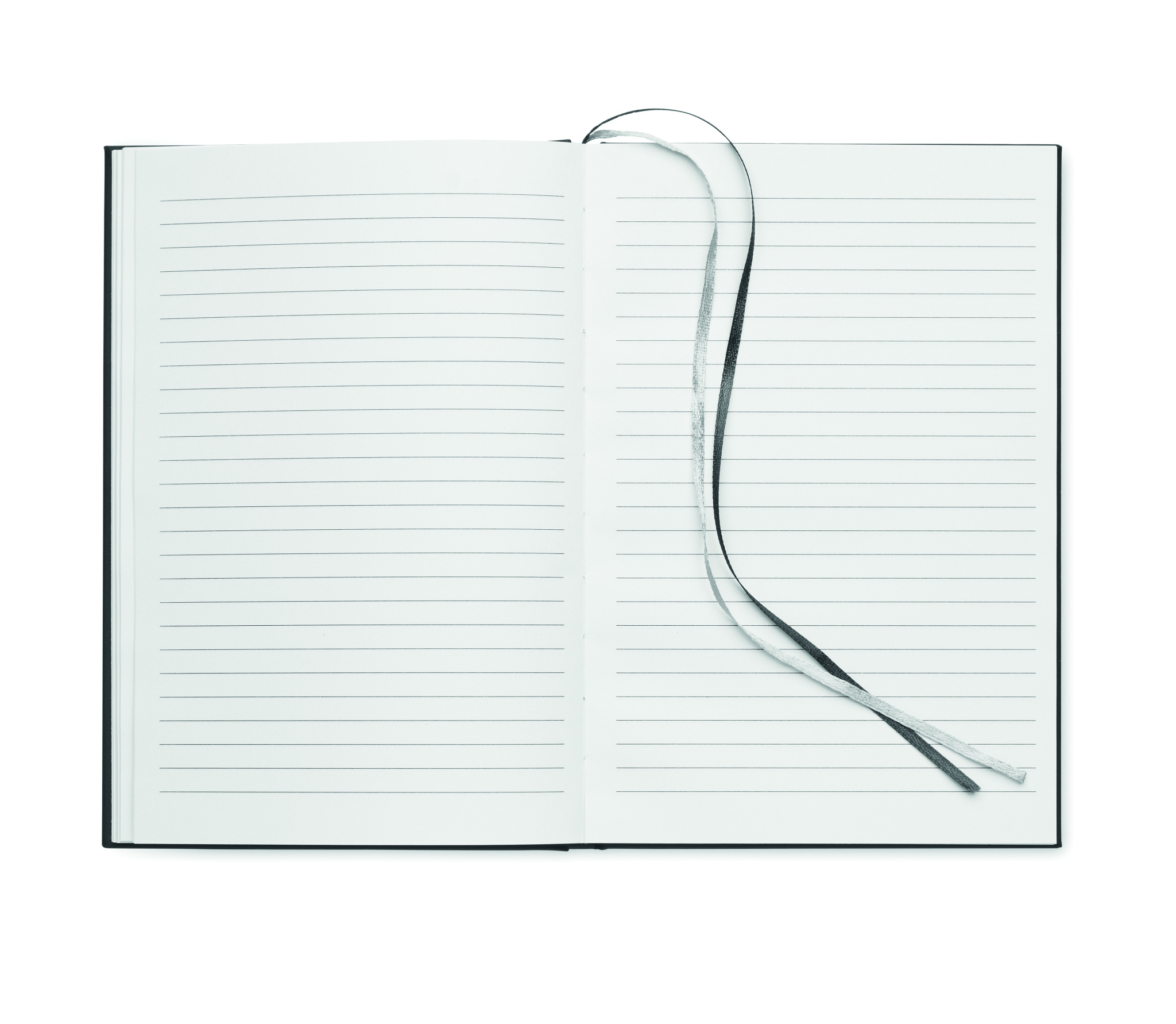 A5-muistikirja, jonka kansi on 60 % kierrätettyä post consumer polyesteriä ja 40 % PU-kangasta. Nidottu. 256 viivoitettua sivua 70 g/m² kierrätyspaperia (128 arkkia). 2 polyesterinauhasta tehtyä sivumerkkiä.