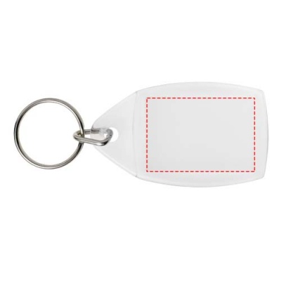 Kirkas P5-avaimenperä, jossa on metallinen avainrengas. Tulosteinsertin mitat: 3,5 cm x 2,4 cm.