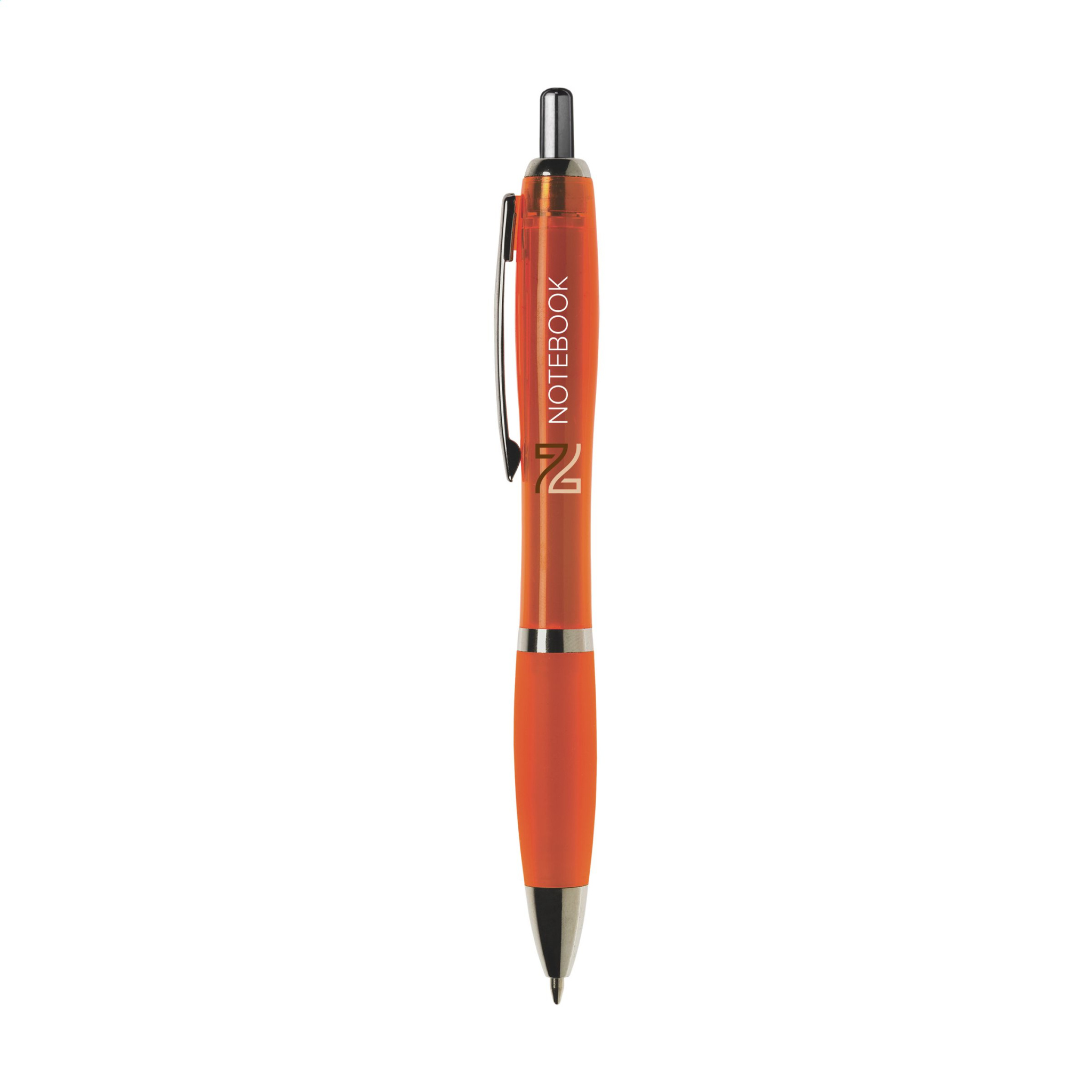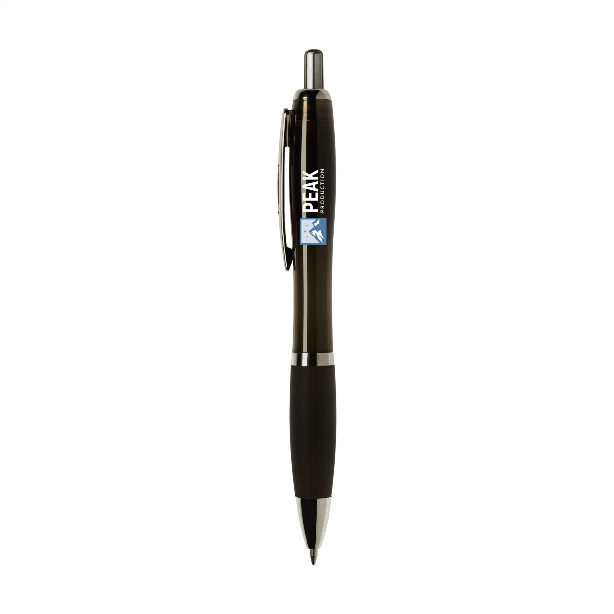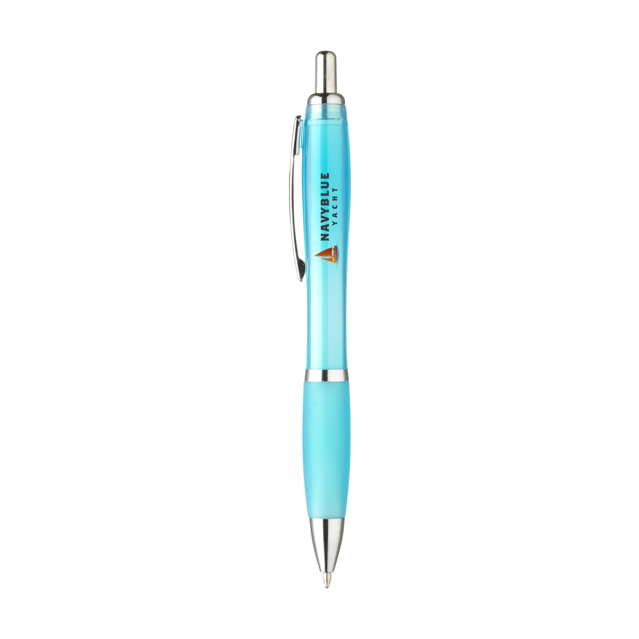 Sinisellä tai mustalla musteella kuulakärkikynällä on läpinäkyvä värillinen piippu, liukumaton kahva ja metallipidike.