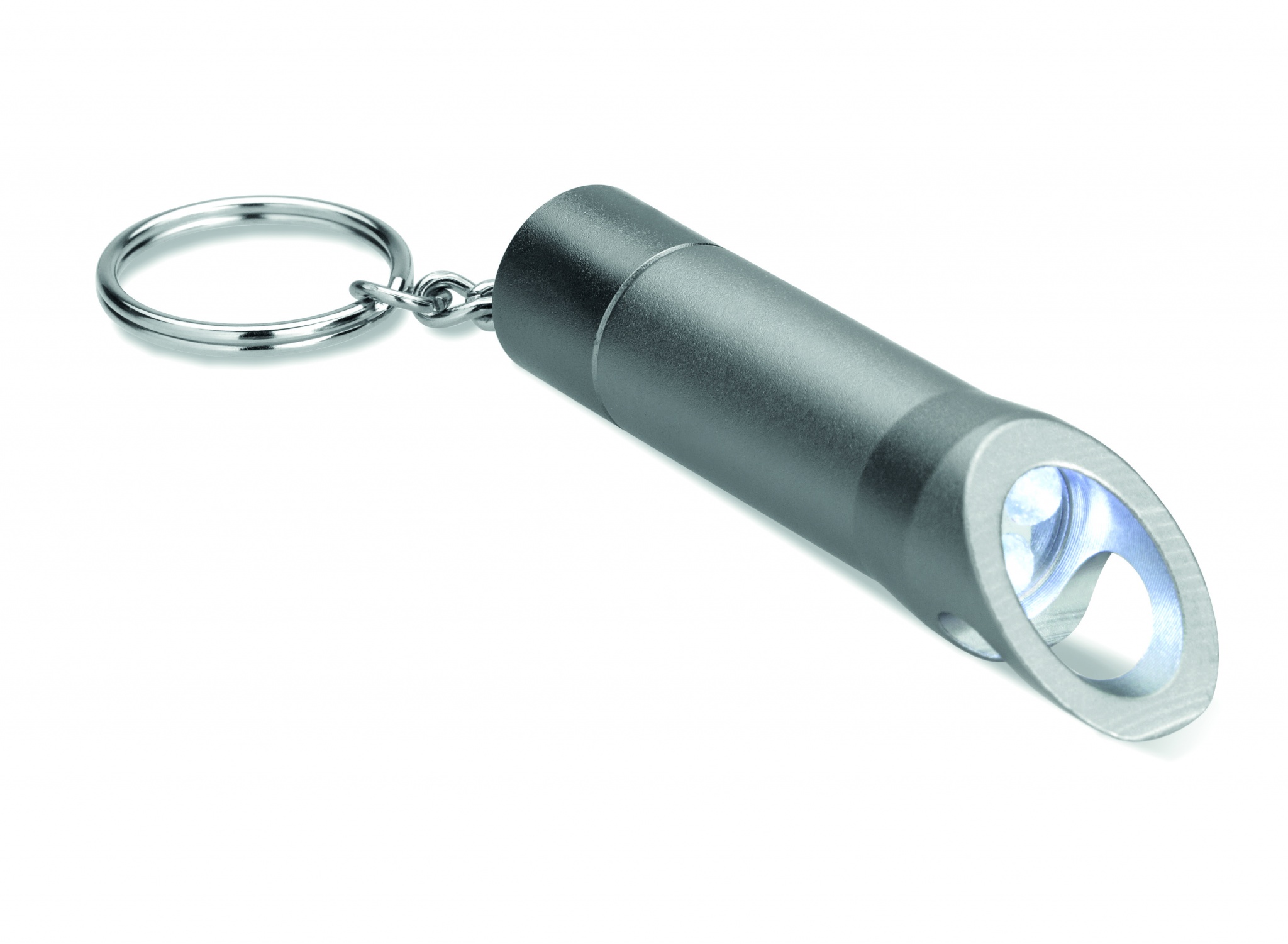 Metallinen LED-taskulamppu avaimenperä, pullonavaajalla. Patterit eivät sisälly toimitukseen.