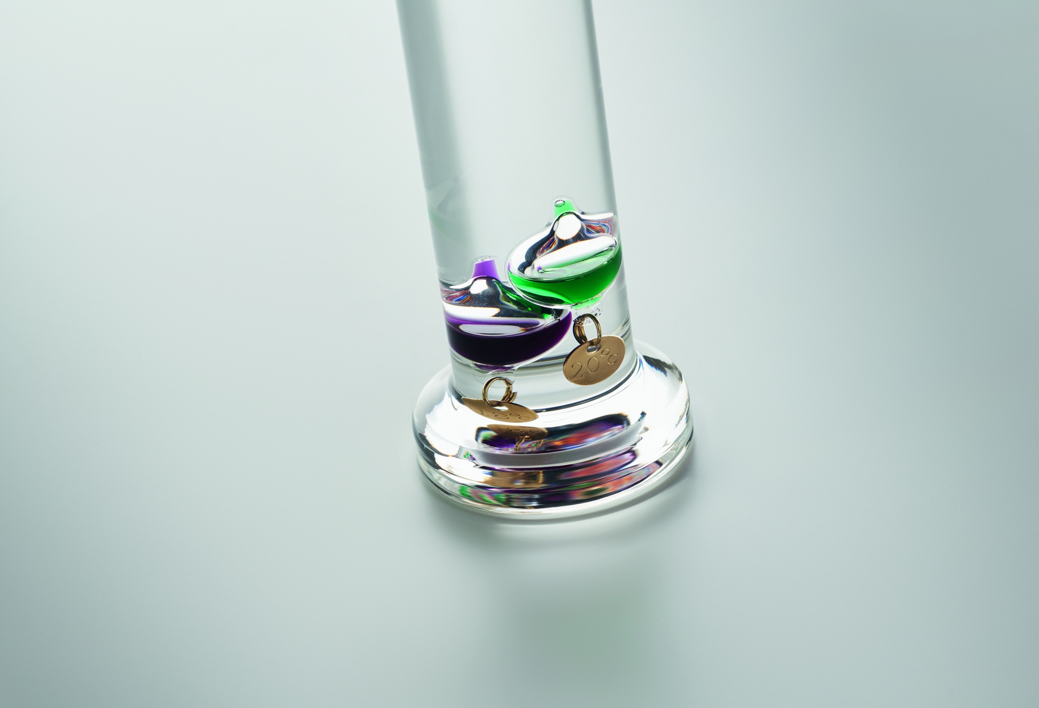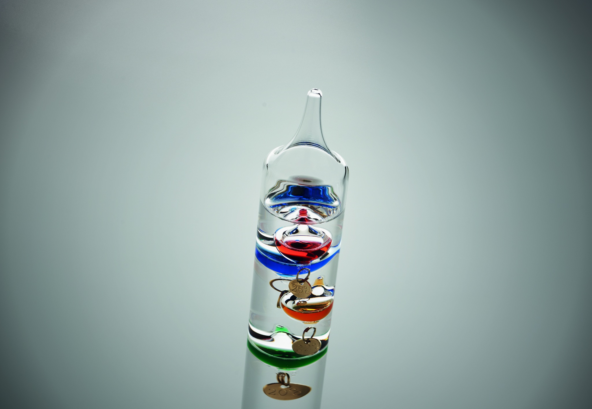 Lasinen Galileo-lämpömittari, jossa on viisi värillistä kelluvaa palloa. Kukin pallo osoittaa lämpötilan 18 °C:sta 26 °C:een: Punainen 26°, royalsininen 24°, oranssi 22°, vihreä 20° ja violetti - 18°. Ylimmän ryhmän alin pallo osoittaa ympäristön lämpötilan.