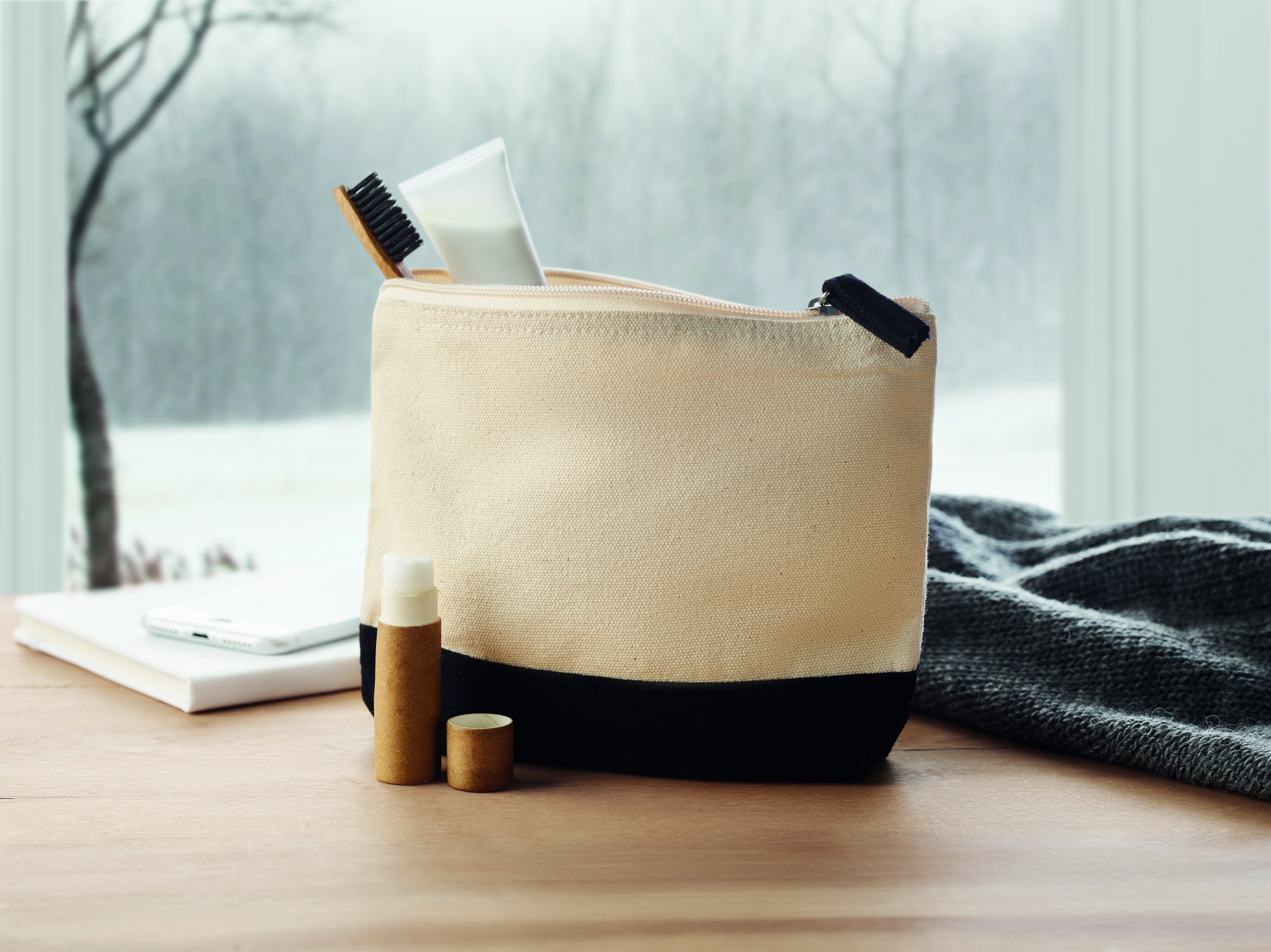 340 g/m² puuvilla kosmetiikkalaukku värillisellä pohjalla ja väriltään yhteensopivalla vetoketjulla.
