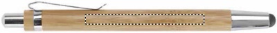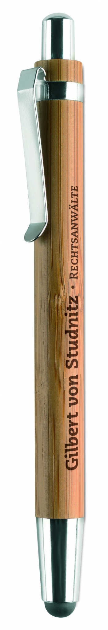 Bambusta valmistettu kuulakärkikynä sinisellä musteella ja kosketusnäyttöpäällä, krominväriset yksityiskohdat.