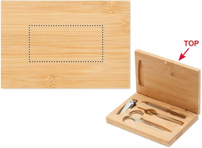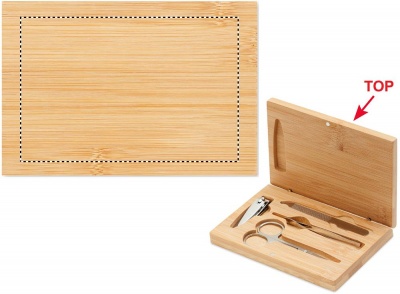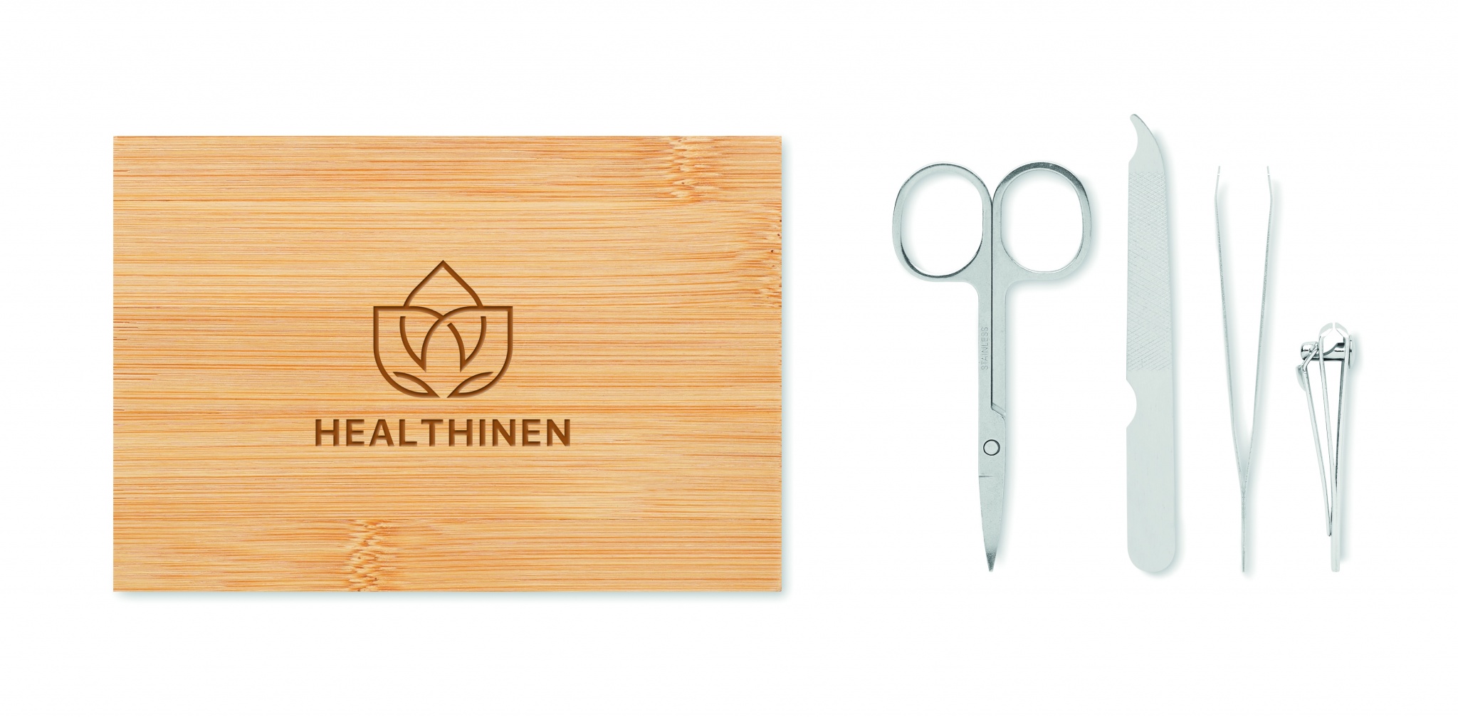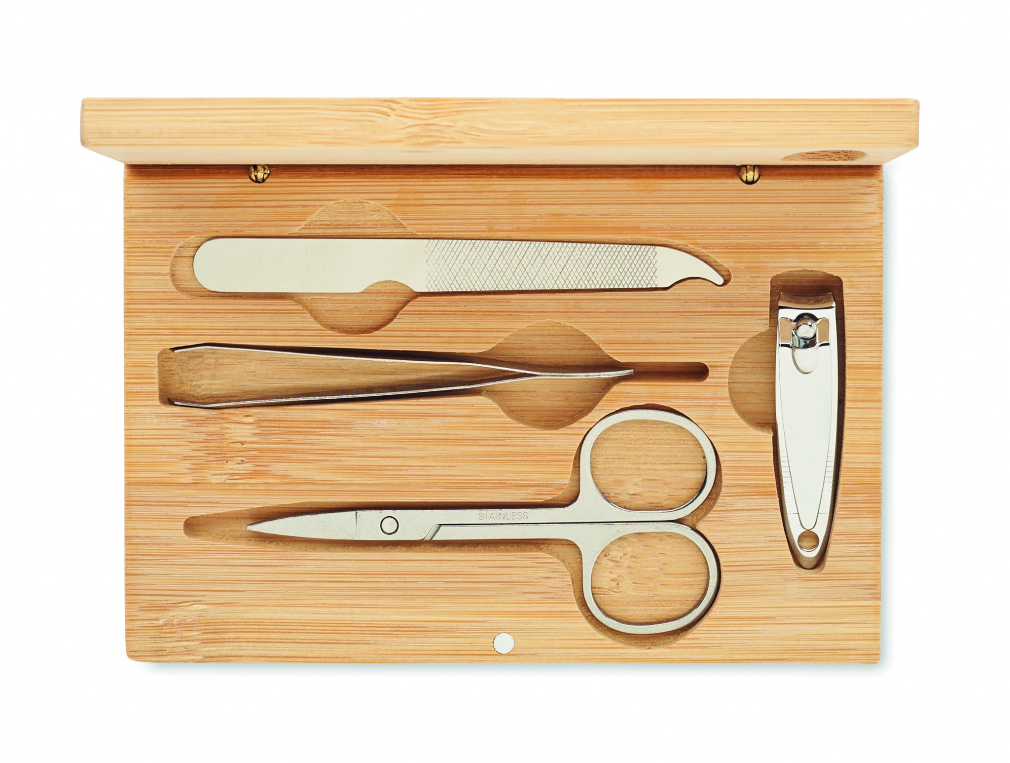 4-osainen ruostumattomasta teräksestä valmistettu manikyyrisetti bambukotelossa magneettisulkimella, sisältää kaarevat kynsisakset, kynsileikkurin, kynsiviilan ja pinsetit.