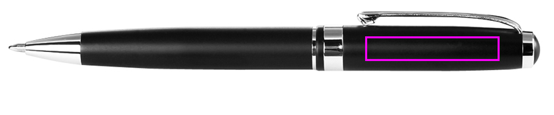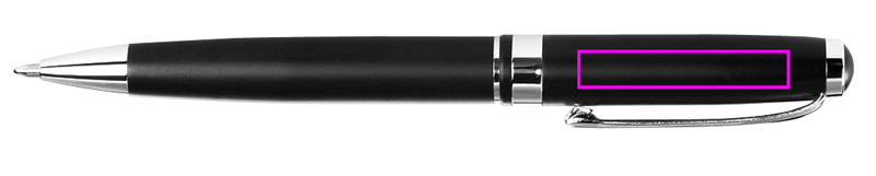 Laadukas metallikynä mattamustalla, kiiltävällä hopealla ja tyylikkäällä kotelolla. Kaivertamme logosi klipsien alle.