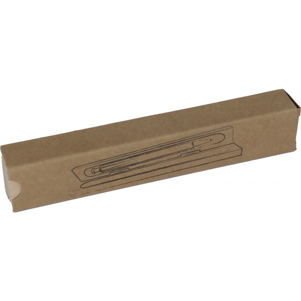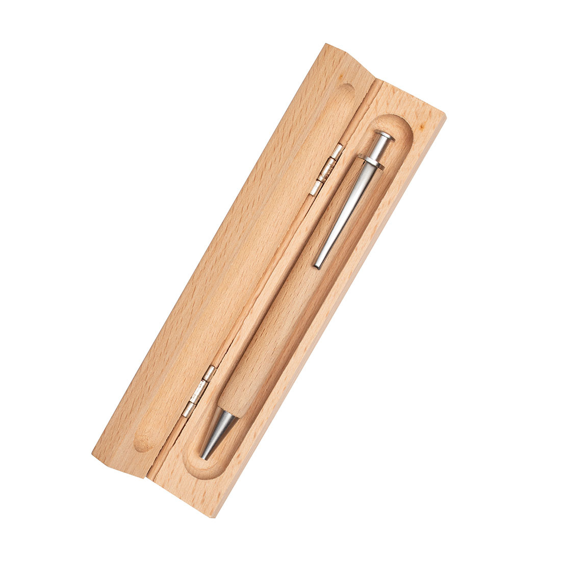Puinen kuulakärkikynä, jossa on sinikirjoitusmetallijärjestelmän täyttö ja puinen kotelo. Laserkaiverrus on asennettu pidikkeen alle.