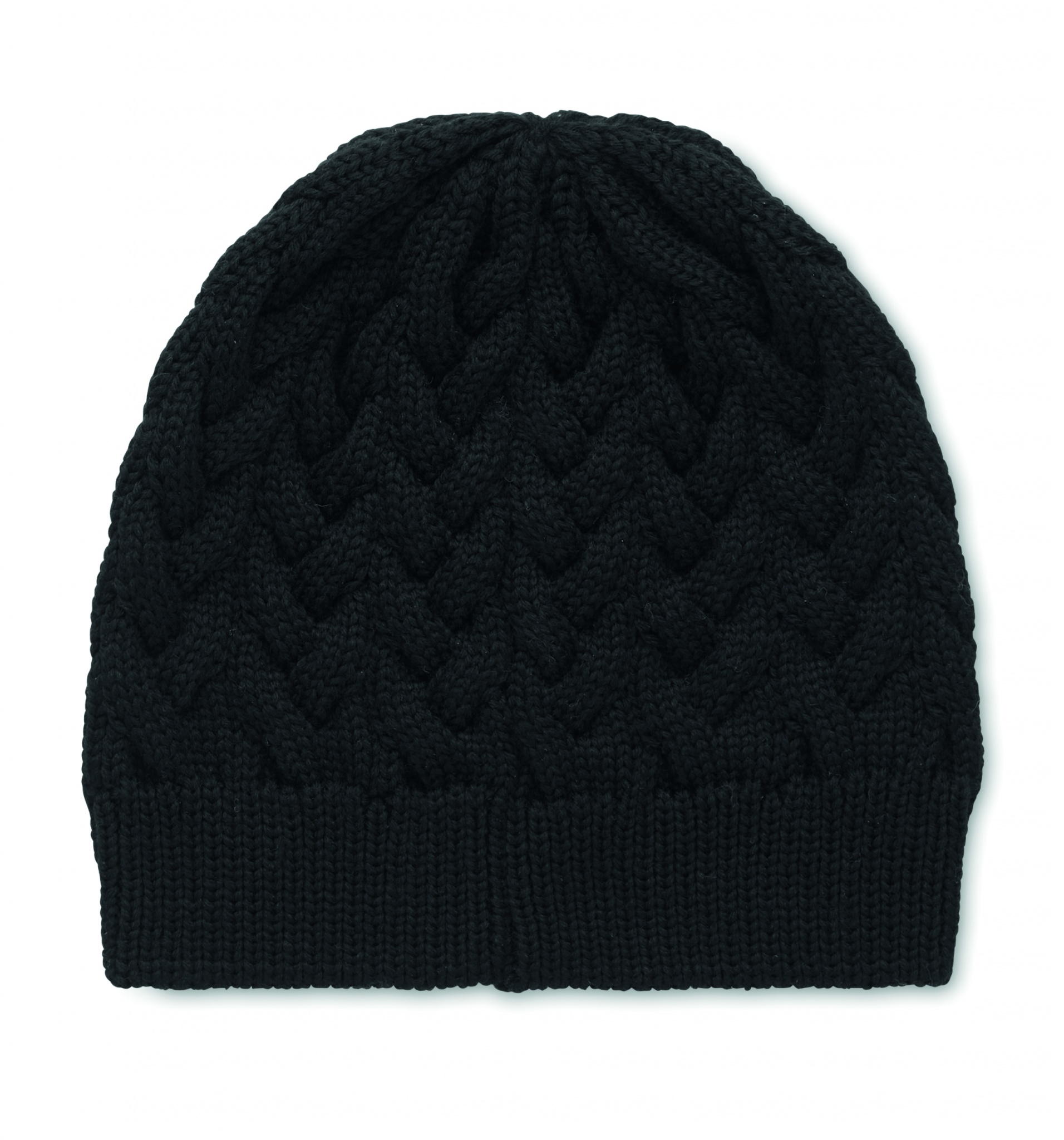 Neulottu RPET pipo, tuotteessa etiketti painatusaluetta varten.
