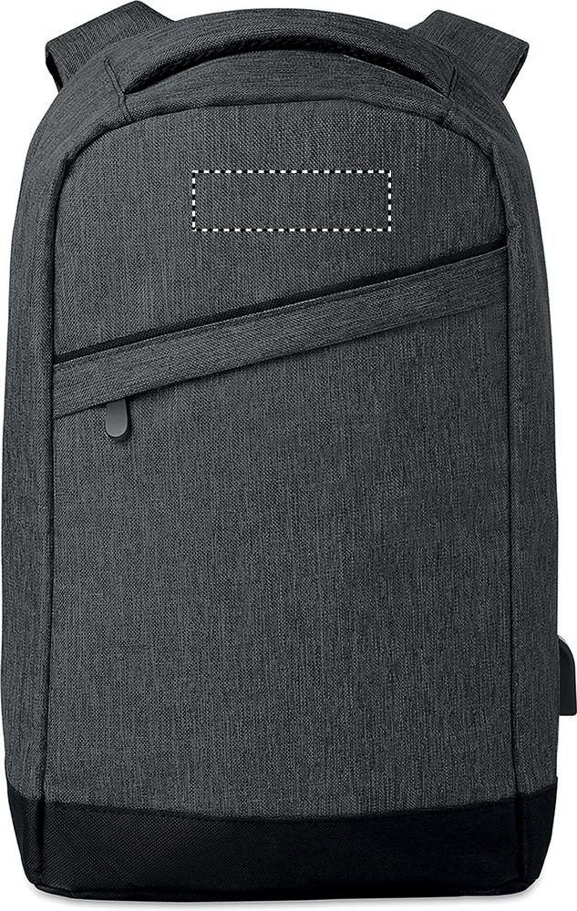 600D- 2 sävyinen polyesterireppu, pehmustetuilla olkahihnoilla. Sisältää yhden 13 tuuman kannettavan tietokoneen taskun ja USB-latauskaapelin. Vetoketjullinen tasku repun selkäosassa.