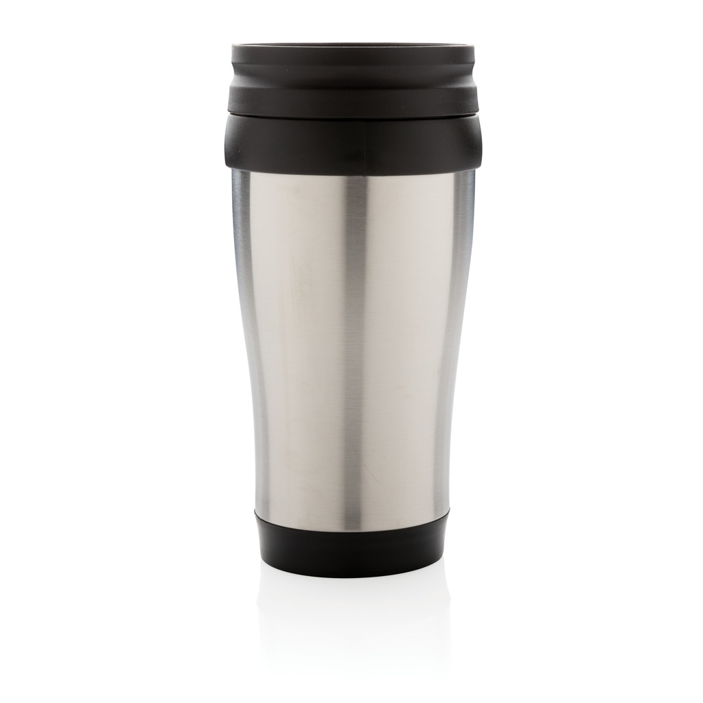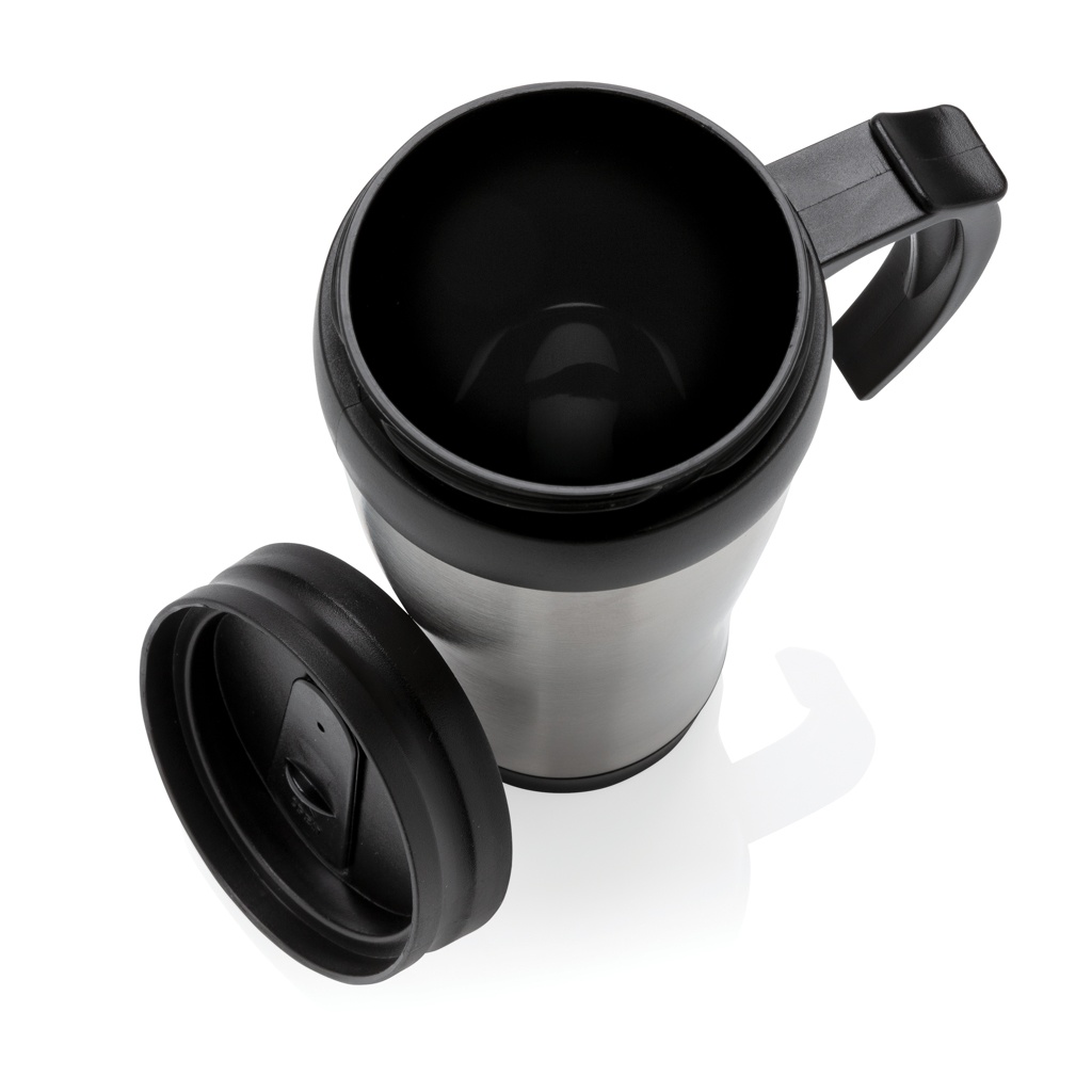 350 ml muki, ulkopuoli ruostumatonta terästä, sisäpuoli PP, mustat kansi ja pohja.