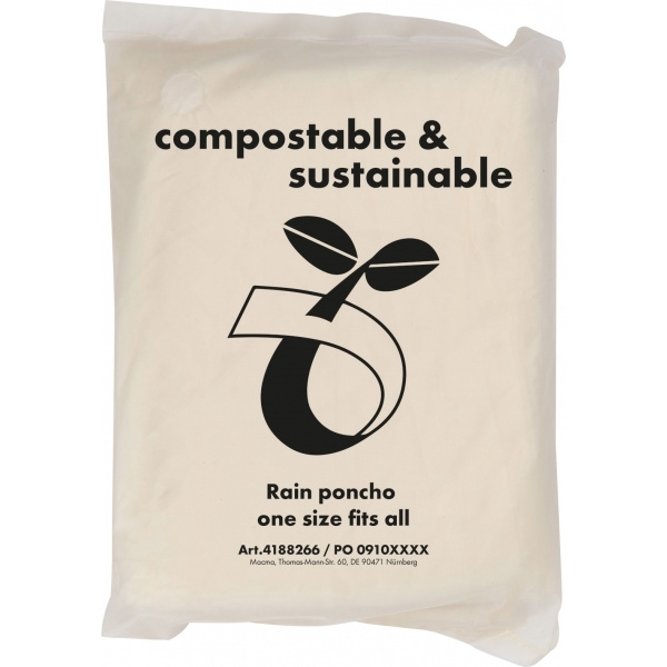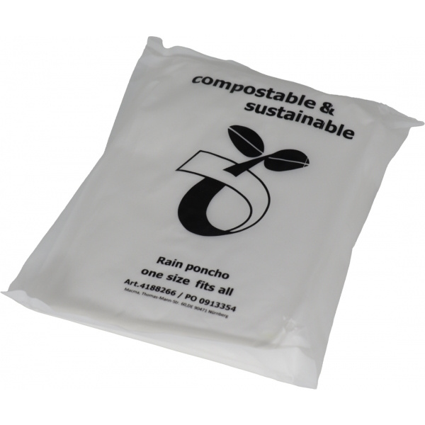 PLA:sta valmistettu ftalaatiton kompostoitava sadeponcho kantokassilla. Tämä poncho on kestävä vaihtoehto. Logosi painetaan pussiin.