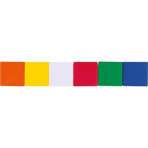 Vaahtopolyuretaanista (PU) valmistettu stressinvaimennuskuutio. Logosi on kaiverrettu kuution toiselle puolelle laserkaiverruksella.