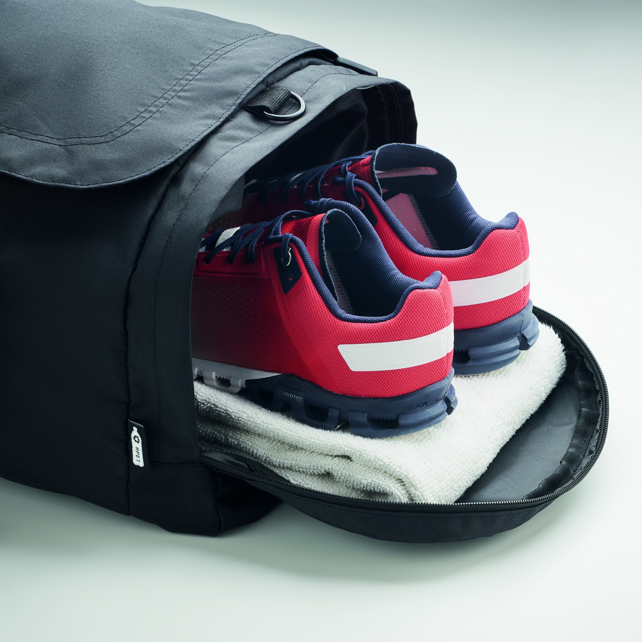 Suuri laukku urheiluun tai matkalle 300D RPET-polyesteristä. Päälokero vetoketjulla ja muita säilytyslokeroita. Irrotettava vahvistettu alaosa sekä säädettävä ja irrotettava olkahihna.