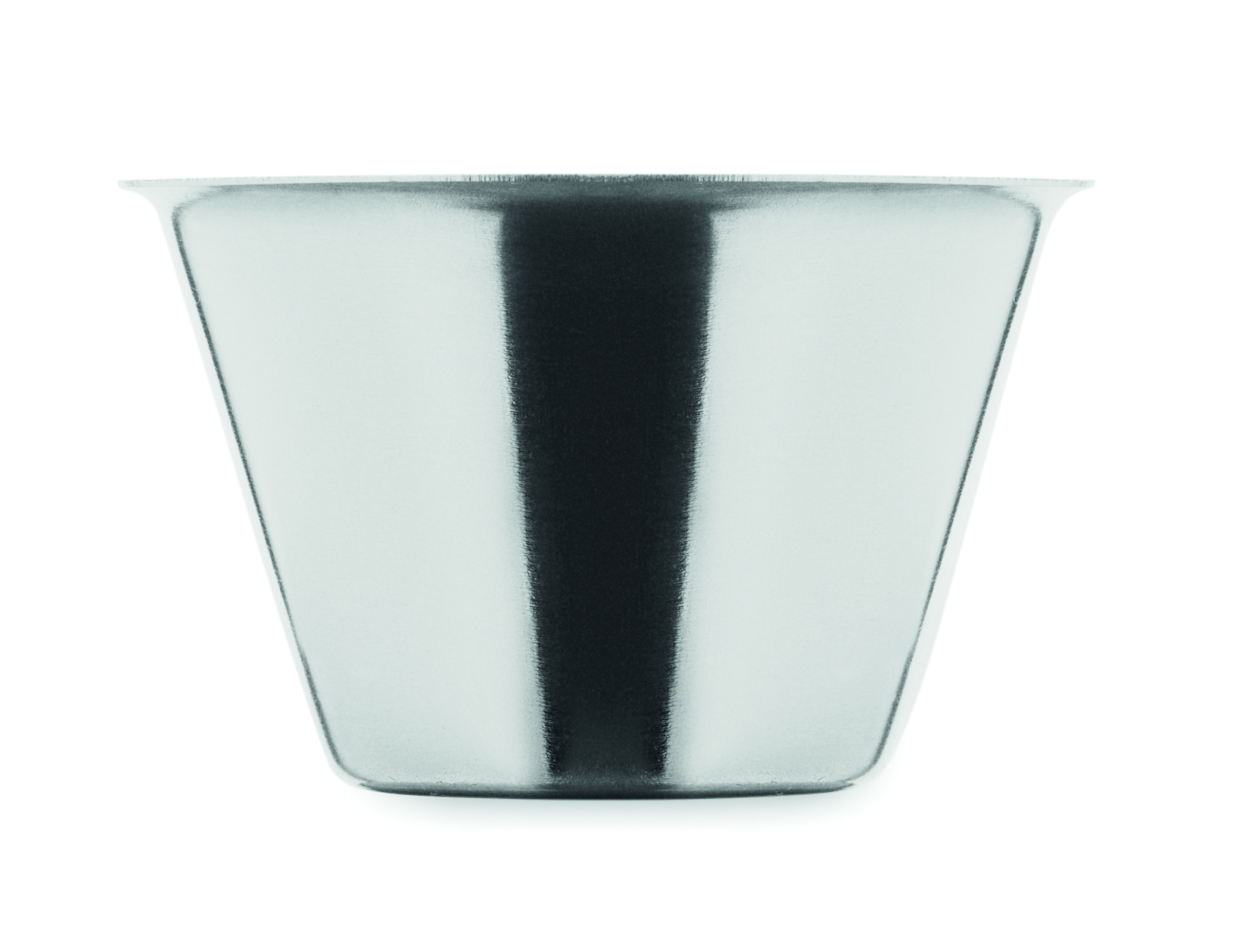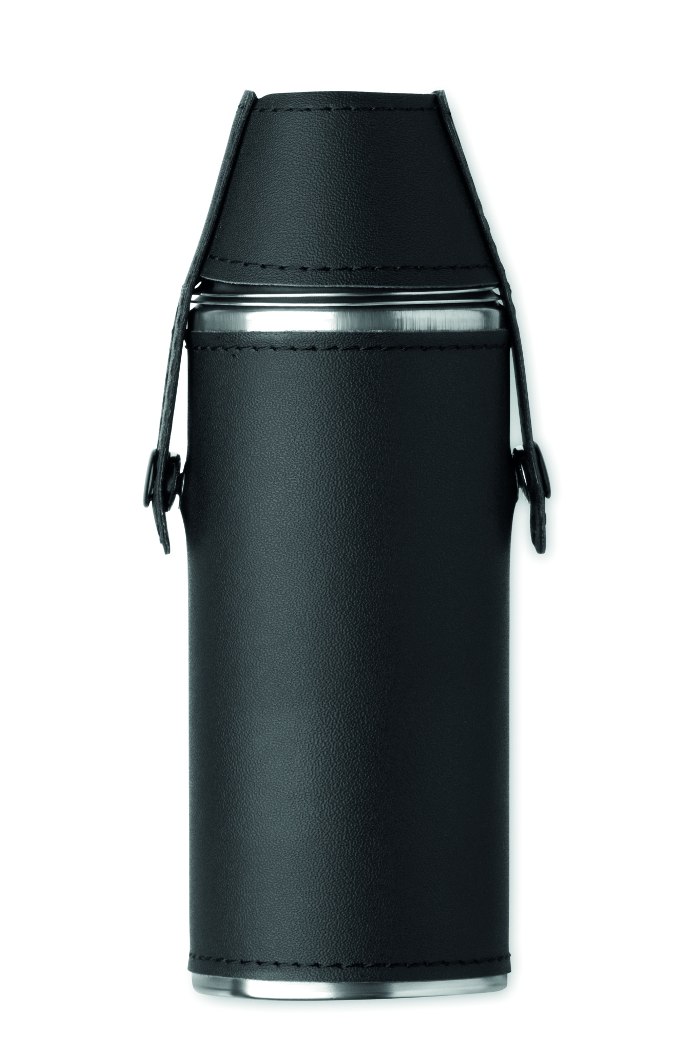 Ruostumattomasta teräksestä valmistettu taskumatti, jossa PU-nahkapinta ja kaksi ruostumattomasta teräksestä valmistettua 20 ml:n shottimukia kannessa. Tilavuus: 230 ml.