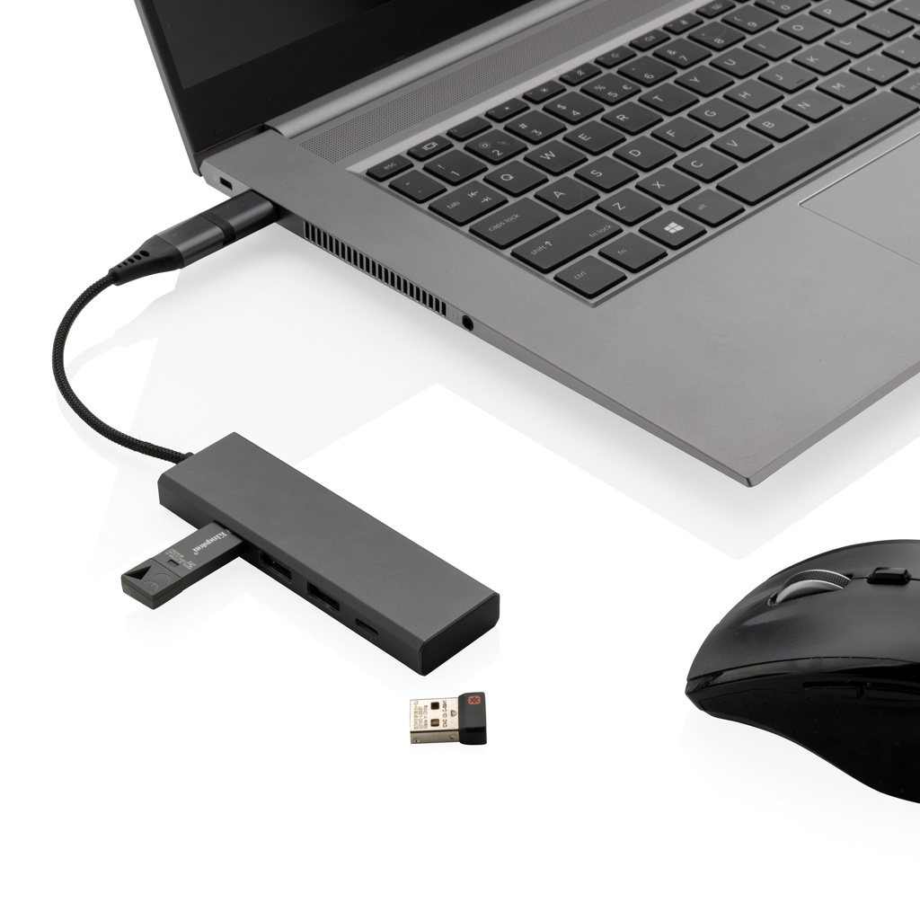 Alumiininen USB-hub, joka on valmistettu RCS (Recycled Claim Standard) -sertifioidusta kierrätetystä alumiinista, ABS:stä, TPE:stä ja PET-materiaalista. 3 USB A 2.0 porttia ja 1 tyypin C portti. Hubissa on sisäänrakennettu 10cm kaapeli, joka on valmistettu kierrätetystä RCS-sertifioidusta TPE/PET materiaalista. Kierrätetyn materiaalin kokonaismäärä: 75% perustuen tuotteen painoon. RCS sertifiointi varmistaa kierrätettyjen materiaalien täysin sertifioidun toimitusketjun. Tuplaliitin, joten sopii sekä tyypin C että tyypin USB A tietokoneille. Alumiini ei menetä ominaisuuksiaan kierrätysprosessissa, ja sitä voidaan kierrättää loputtomasti. Tuote ja tarvikkeet 100% PVC-vapaita. Pakattu FSC sekoituksesta valmistettuun pakkaukseen. Tukee datansiirtoa.
