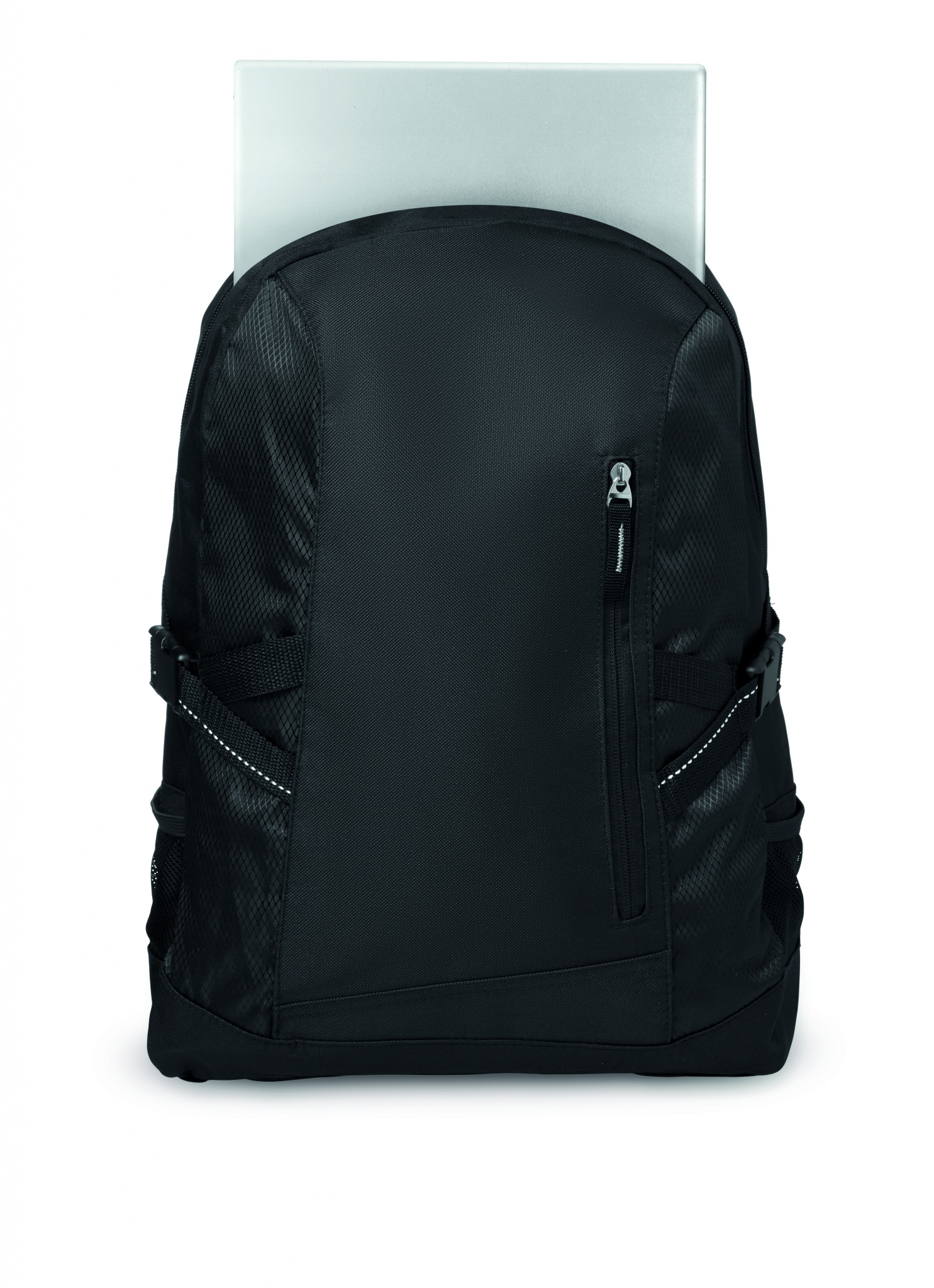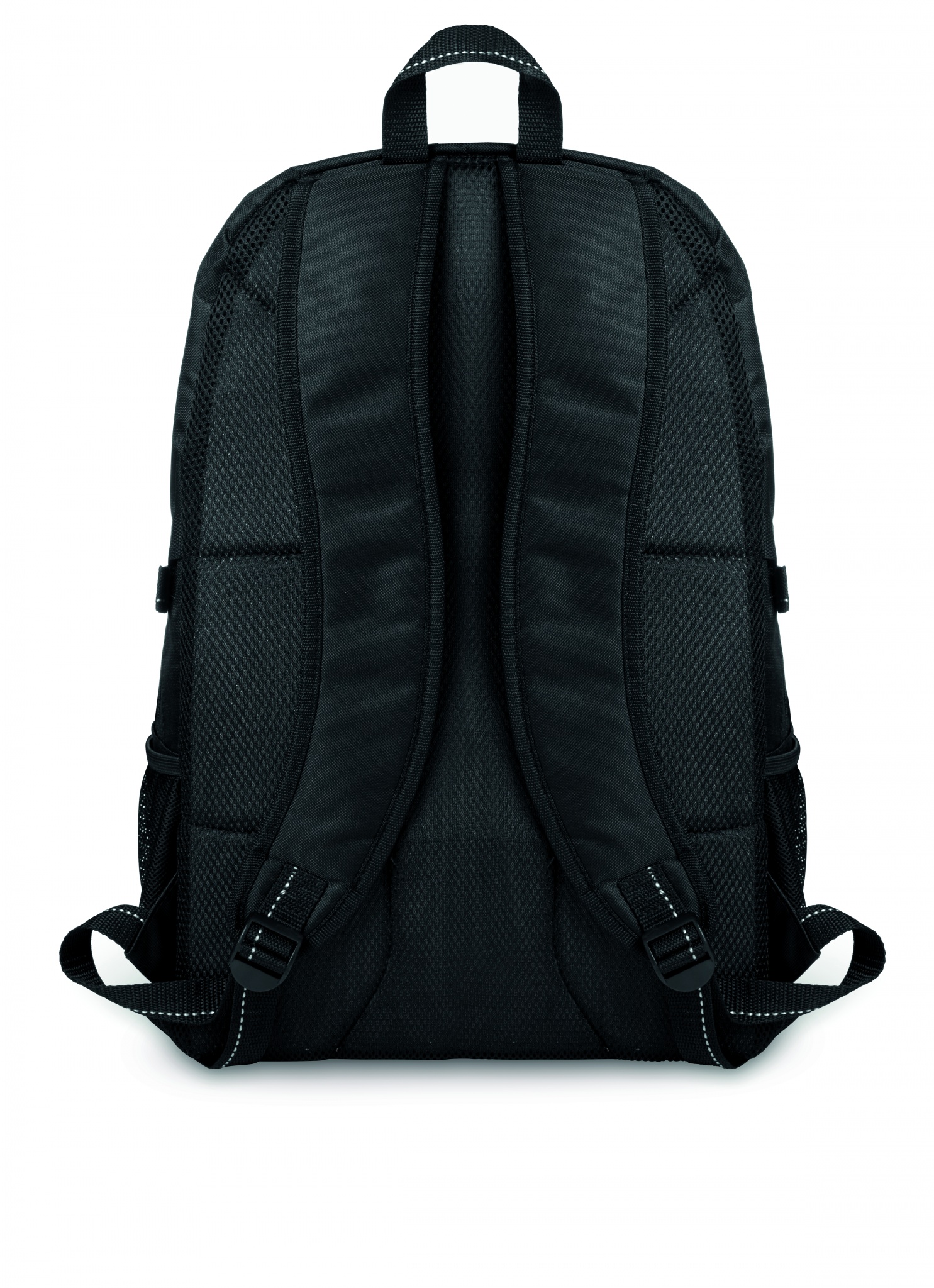 600D tietokonereppu rip-stop yksityiskohdilla, sisältää 15 tuuman kannettavan tietokoneen lokeron, vetoketjullisen etutaskun ja 2 sivulokeroa. Säädettävät olkahihnat.