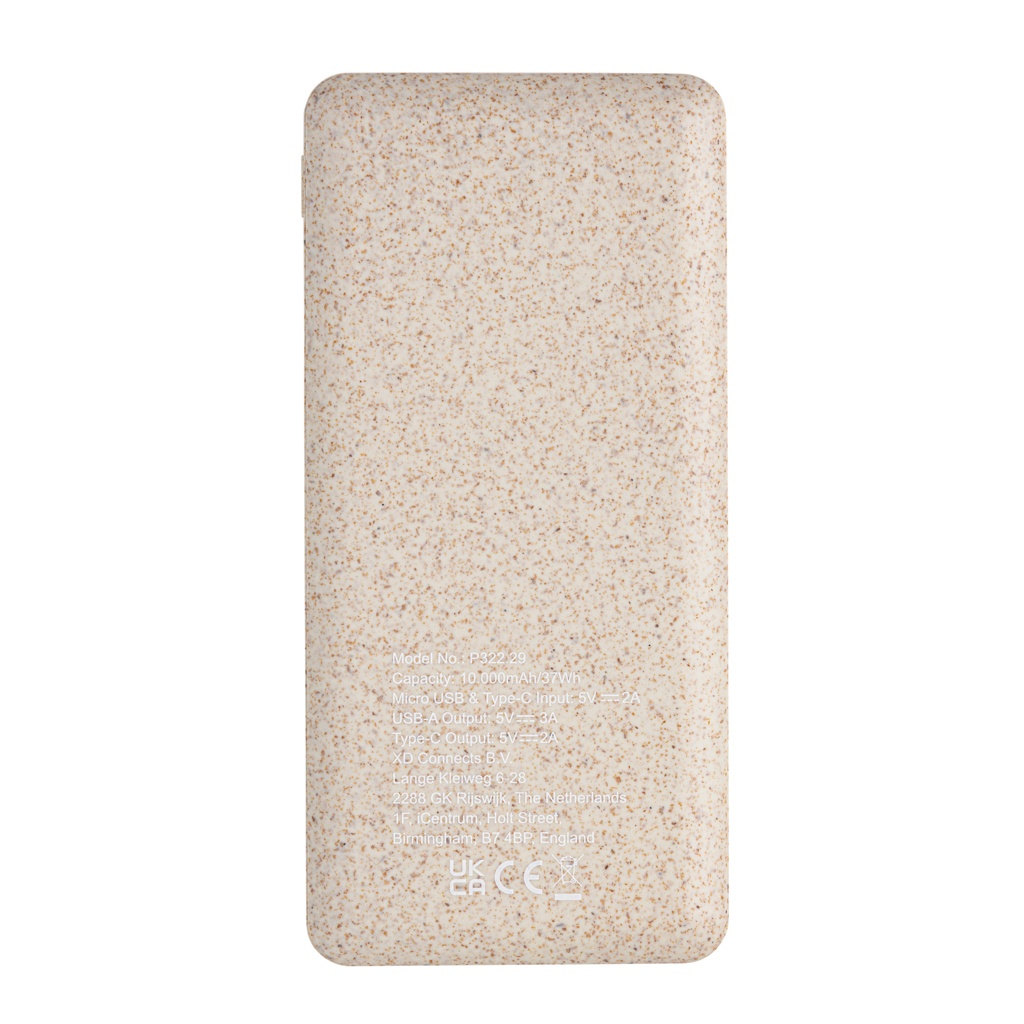 Erittäin ohut 10000mAh varavirtalähde valmistettuna vehnänoljesta (35%) sekoitettuna ABS-materiaaliin. Täyteenladattuna varavirtalähteellä voi ladata puhelimen täyteen jopa neljä kertaa. Varavirtalähteessä on A-luokan 10000mAh:n litiumpolymeriakku. Tupla USB-portti, jossa tyypin C ulostulo kaikkia uusia puhelimia varten. Virran merkkivalo viestii jäljellä olevan energian määrän, joten tiedät aina, koska tuote tulee ladata uudelleen. Sisältää mikro USB TPE-materiaalista valmistetun kaapelin latausta varten. Mikro USB sisääntulo 5V/2A; tyypin C sisääntulo 5V/2A; USB ulostulo 5V/3A; tyypin C ulostulo 5V/2A; Tuote ja lisätarvikkeet PVC-vapaita.