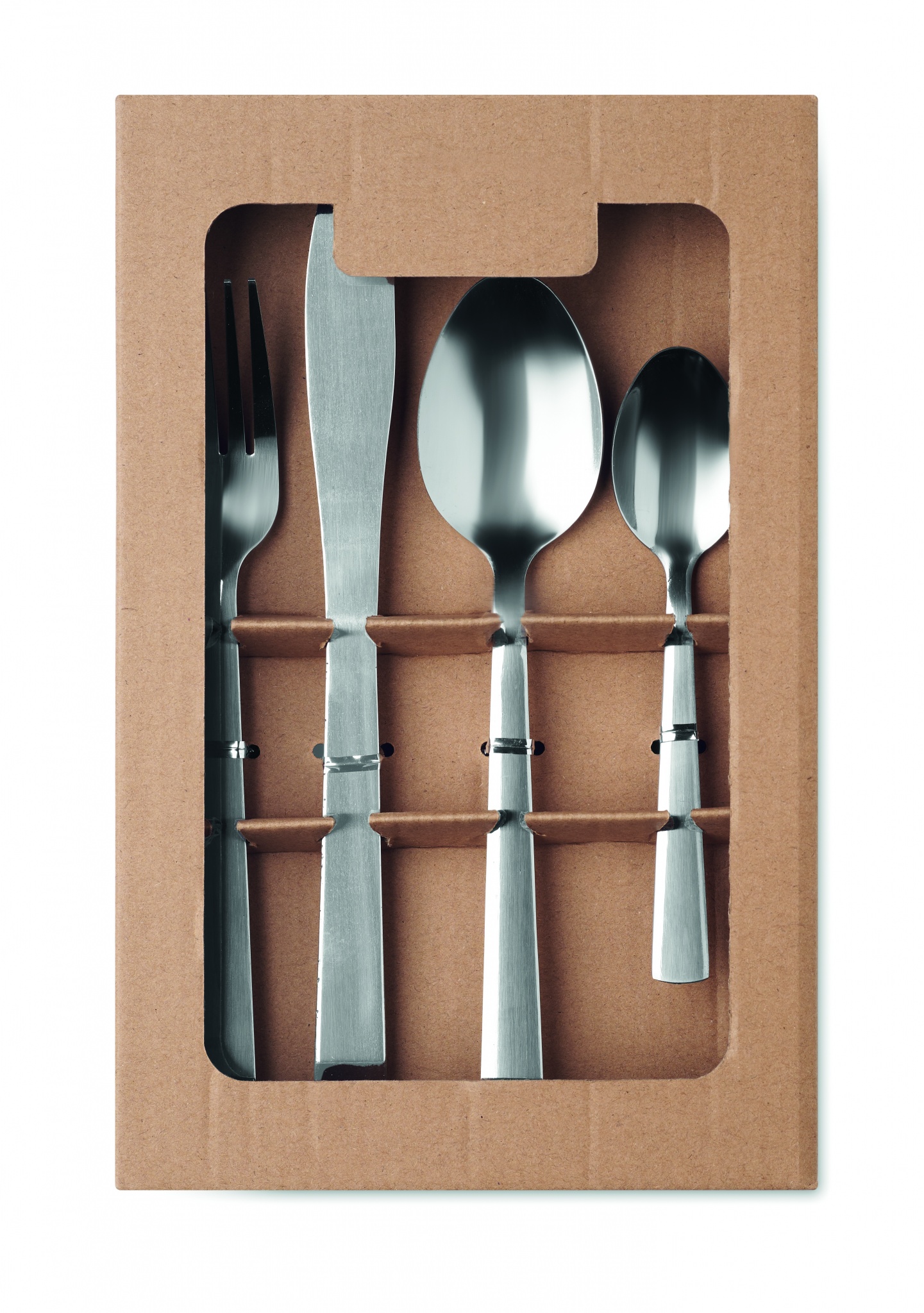 16 dalių nerūdijančio plieno stalo įrankių rinkinys, skirtas 4 stalviršiams. Įskaitant: arbatinis šaukštelis, valgomasis šaukštas, šakutė, peilis. Pateikiama kraftpopieriaus dėžutėje.