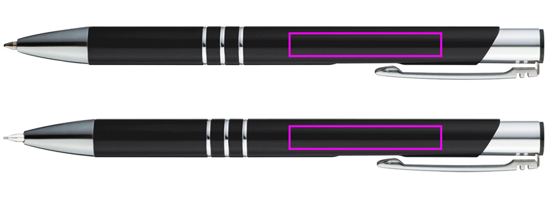 Rašymo rinkinys, pagamintas iš aliuminio, kurį sudaro tušinukas su mėlynu didelės talpos rašikliu ir mechaninis pieštukas, kiekvienas su dekoratyviniais žiedais. Jūsų logotipas bus išgraviruotas klipo dešinėje.