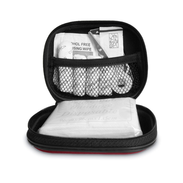 Аптечка. Включает ножницы, 3 марлевых тампона ,1 бинт, рулон ваты, 2 дезинфицирующие салфетки, 5 пластырей, жгут и 6 ватных дисков