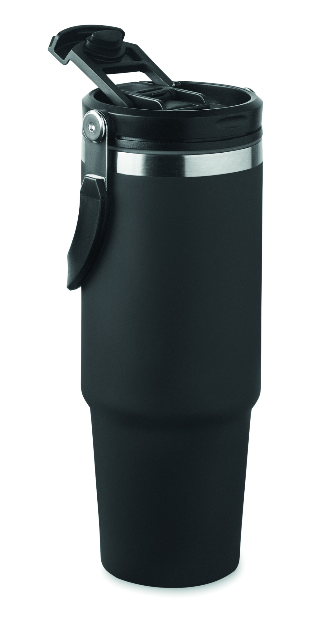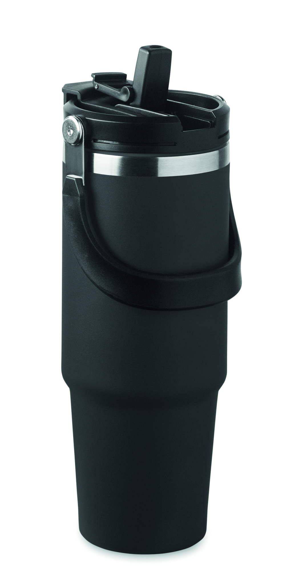 Double wall recycled stainless steel (90% recycled stainless steel and 10% stainless steel) tumbler with lid with inner straw, foldable mouth piece and direct drinking opening . Capacity 850 ml.