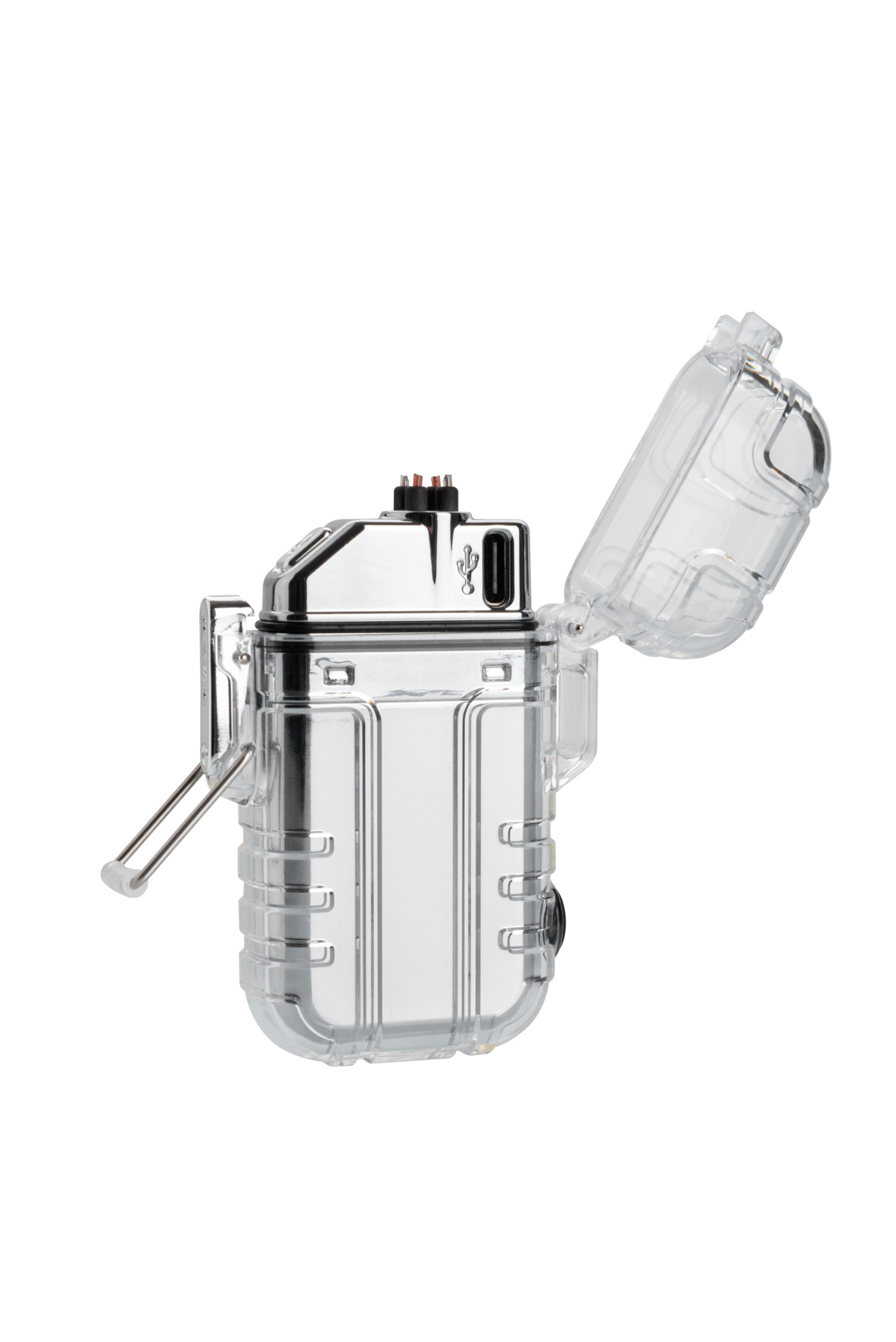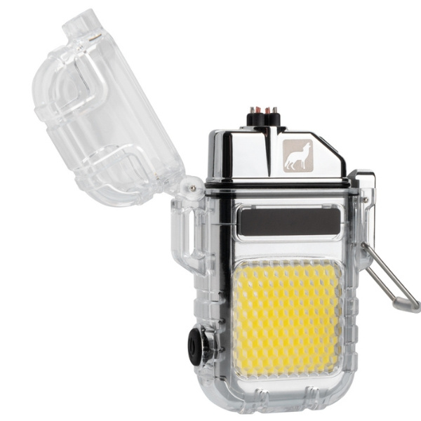 Электрическая перезаряжаемая зажигалка с фонариком COB. Зажигалка работает на основе электрического разряда вместо пламени. Фонарик имеет три различных режима освещения. Заряжается через USB-кабель, который входит в комплект. Время зарядки зажигалки составляет 1–2 часа, а полной зарядки зажигалки хватает примерно на неделю или после 100–200 зажиганий.
